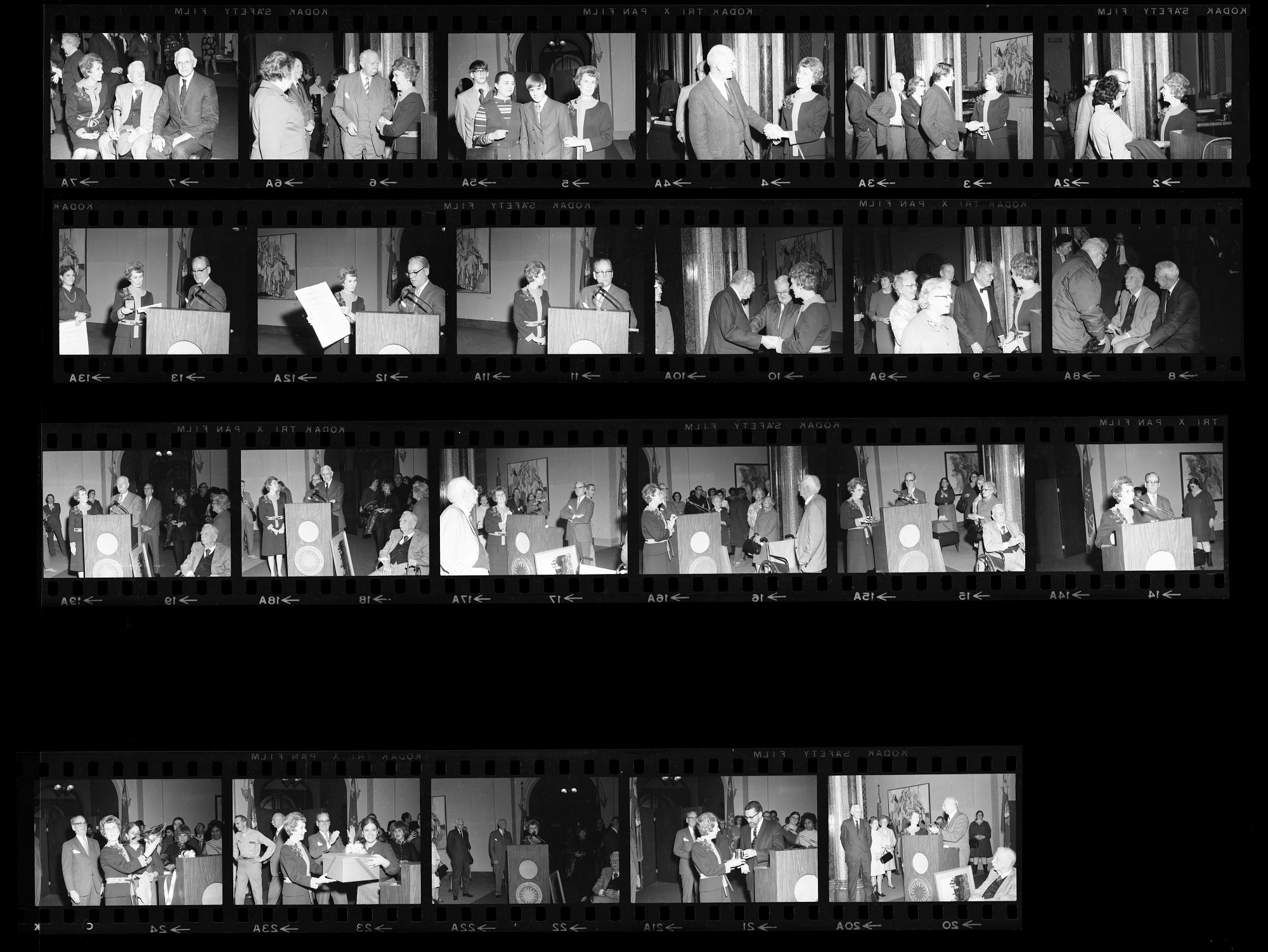 Retirement party for Helena M. Weiss (Chief, Division of Correspondence and Documents, 1948-1956; Registrar, Office of the Registrar, 1956-1971) in the Great Hall of the Smithsonian Institution Building, or Castle, Under Secretary James C. Bradley, and former Secretaries Dr. Leonard Carmichael, Dr. Alexander Wetmore, and Charles Greeley Abbot.