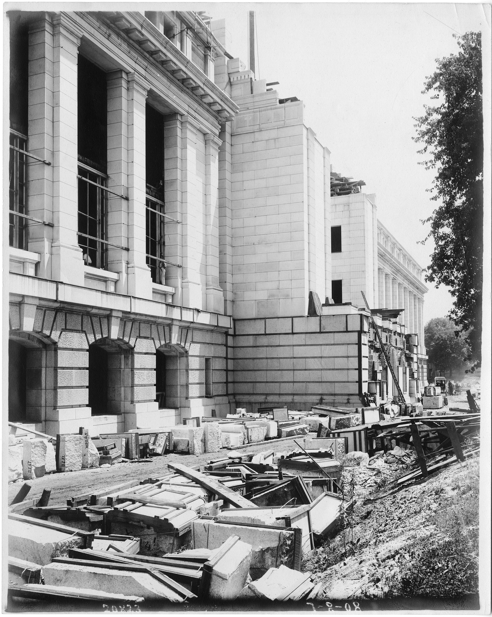 Construction of the United States National Museum, now known as the National Museum of Natural History, July 8, 1908. The exterior walls are almost to their full height, but there are no windows. Building materials are on the ground.