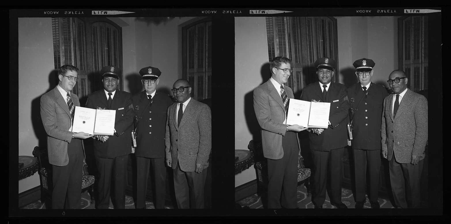 Presentation of Superior Performance Award to guard Robert Montgomery, with Captain Casper Bohnenstiel, Administrative Officer Ralph Anderson, and Assistant Director of Buildings Management Department John Blackwell, in the Arts and Industries Building.