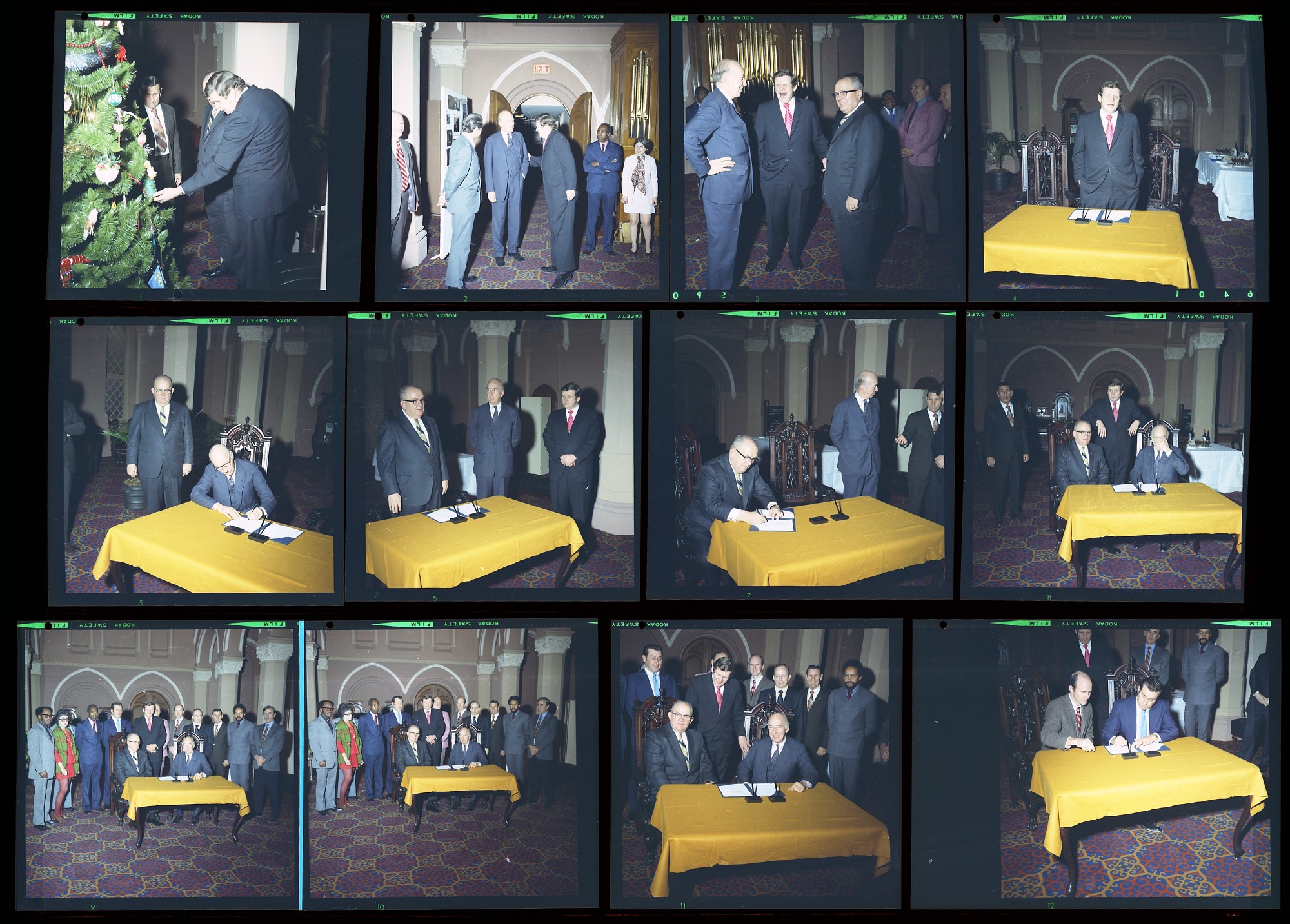 Contract signing between labor union American Federation of Government Employees (AFGE) and Smithsonian Institution representatives in the Great Hall of the Smithsonian Institution Building, or Castle, with Secretary S. Dillon Ripley and Director of Personnel, Vincent J. Doyle.