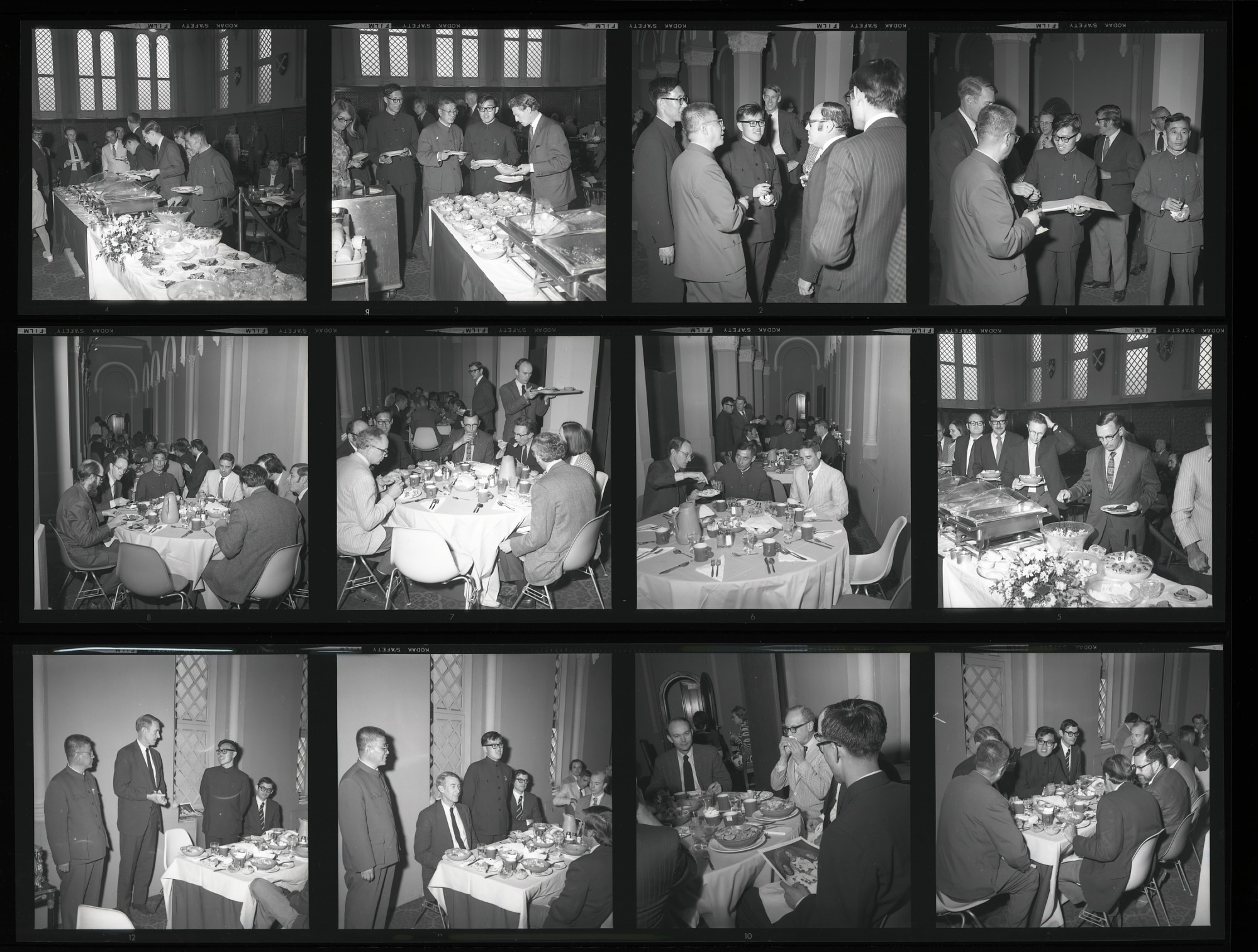 Members of a group of Chinese zoologists who came to present giant pandas Hsing-Hsing and Ling-Ling to the National Zoo dining in the Commons in the Smithsonian Institution Building, or Castle, with David Challinor, Assistant Secretary for Science, Theodore Reed, Director of the National Zoological Park, Daniel J. Boorstin, Director of the National Museum of History and Technology, and Michael Collins, Director of the National Air and Space Museum.