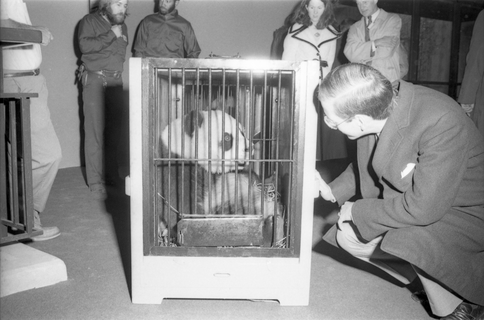 Giant pandas Hsing-Hsing and Ling-Ling arrive in cages at National Zoo.