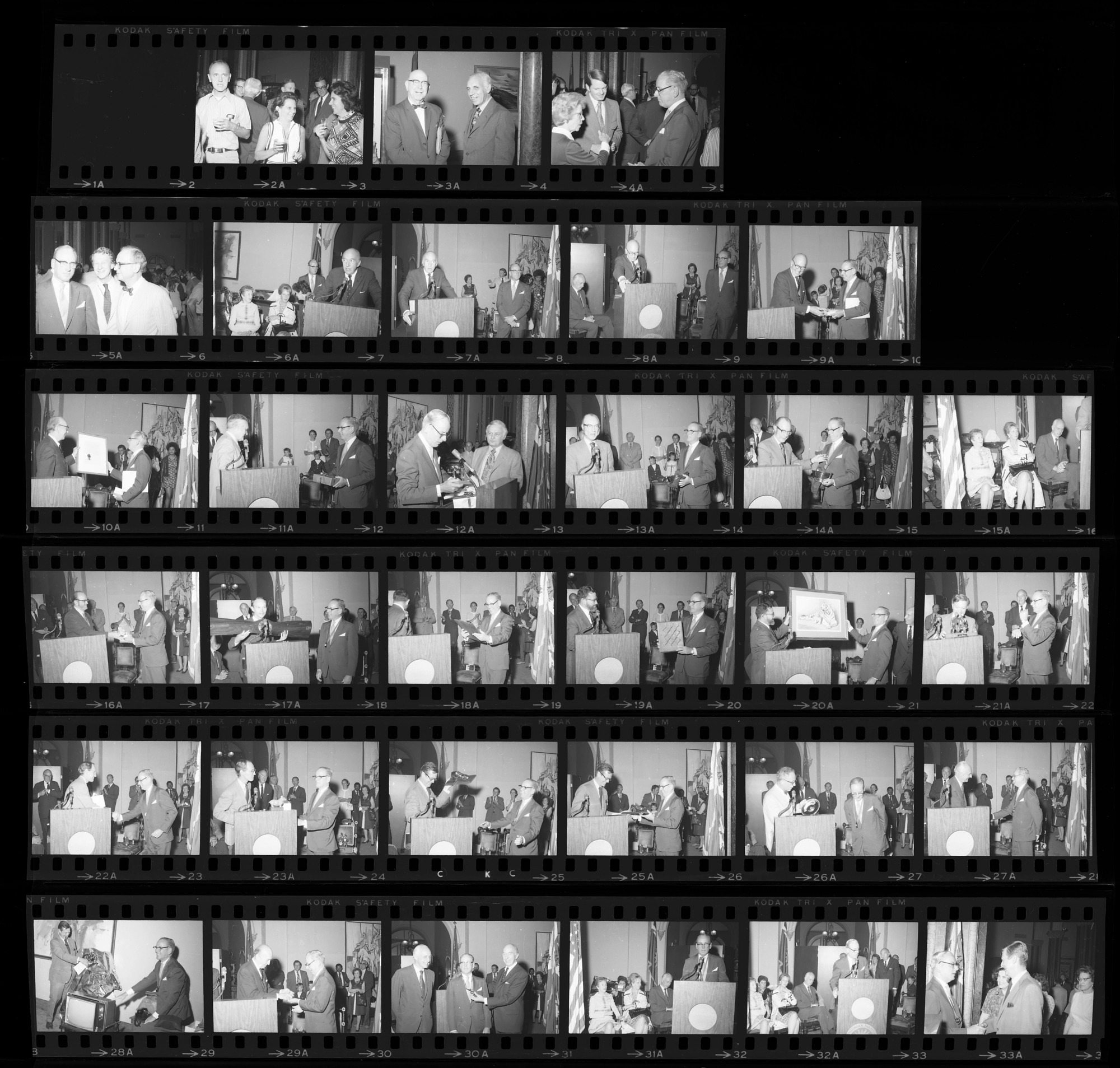 Retirement party for Under Secretary James C. Bradley in the Great Hall of the Smithsonian Institution Building, or Castle, with Secretary S. Dillon Ripley, Mary Livingston Ripley, Daniel J. Boorstin, Director of the National Museum of History and Technology, Richard S. Cowan, Director of the National Museum of Natural History, Michael Collins, Director of the National Air and Space Museum, and Theodore Reed, Director of the National Zoological Park.