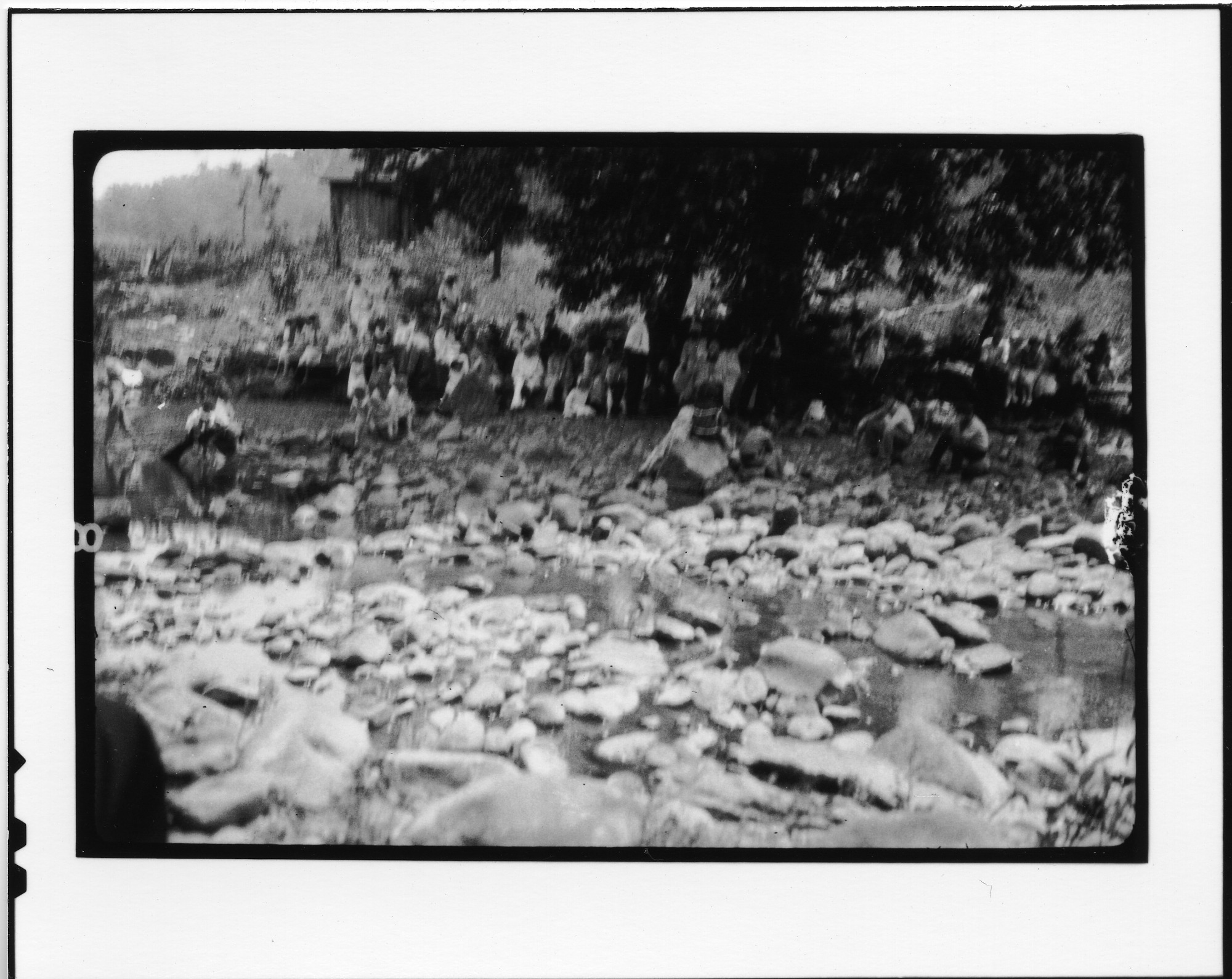 During the weeks of the Scopes trial, an independent group of Holiness movement followers, who rejected the theory of evolution and other expressions of modernism, camped near Dayton and held services every night. Many of the visiting journalists, scientists, and attorneys had observed the group's nighttime services. On Sunday, July 19, 1925, some of the residents of Defense Mansion, including Arthur Garfield Hays, Frank Thone, and Watson Davis, watched an outdoor baptism service being held in a nearby creek. Davis took eight photographs of the events. This photograph may be the one that E. E. Slosson believed to represent "a woman seized by the power of the spirit and going into convulsions."