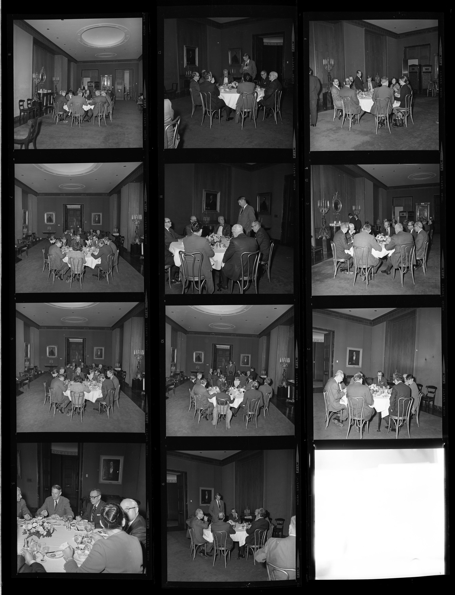 Farewell luncheon for Monroe E. Freeman, Director of the Smithsonian Science Information Exchange (SSIE), in the Reception Suite at the National Museum of History and Technology, now known as the National Museum of American History, with David Challinor, Assistant Secretary for Science.