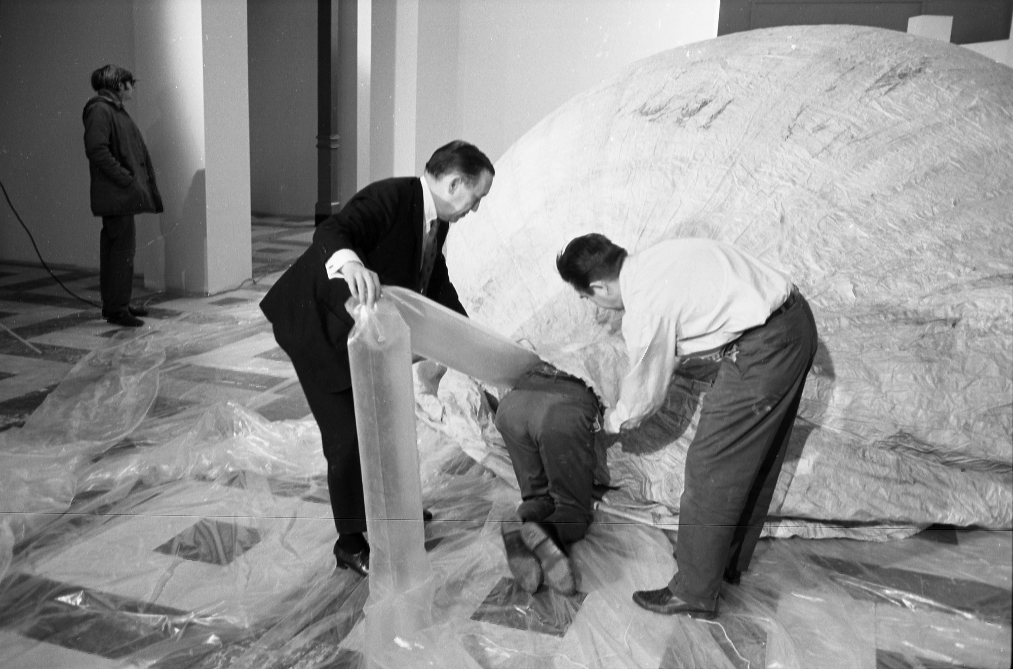 Inflation of a 32 & 1/2 - foot "fire balloon" or Fu-Go, a World War II Japanese attack balloon, for suspension in the Arts and Industries Building (A&I) for the National Air and Space Museum exhibit "Ballooning: 1782-1972," with show director Roger Pineau, and exhibit specialists Ben Snouffer and Bob Klinger.