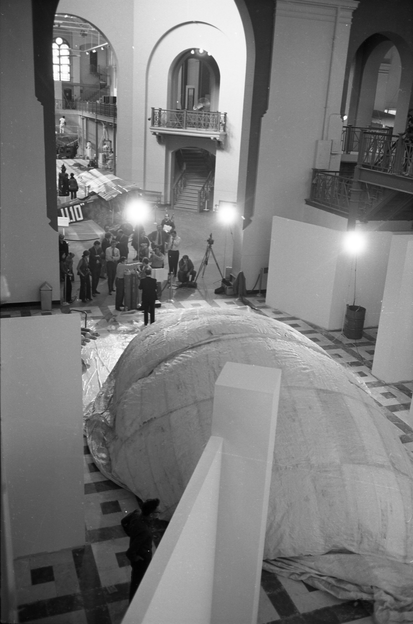 Inflation of a 32 & 1/2 - foot "fire balloon" or Fu-Go, a World War II Japanese attack balloon, for suspension in the Arts and Industries Building (A&I) for the National Air and Space Museum exhibit "Ballooning: 1782-1972," with show director Roger Pineau, and exhibit specialists Ben Snouffer and Bob Klinger.