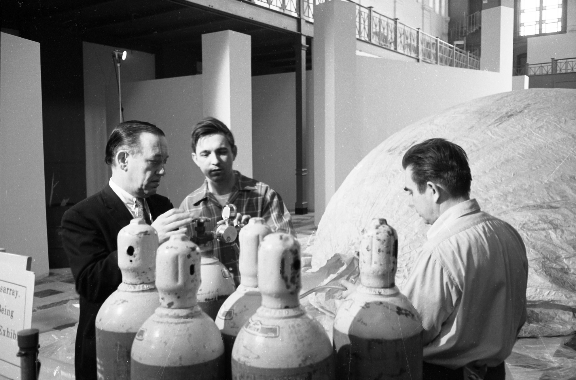 Inflation of a 32 & 1/2 - foot "fire balloon" or Fu-Go, a World War II Japanese attack balloon, for suspension in the Arts and Industries Building (A&I) for the National Air and Space Museum exhibit "Ballooning: 1782-1972," with show director Roger Pineau, and exhibit specialists Ben Snouffer and Bob Klinger.