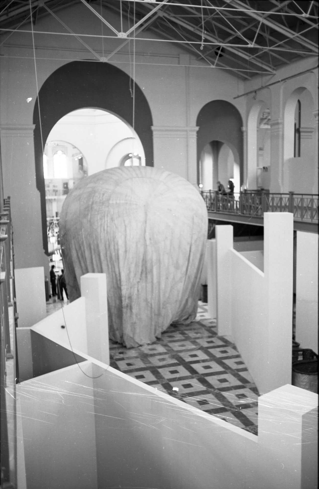 Inflation of a 32 & 1/2 - foot "fire balloon" or Fu-Go, a World War II Japanese attack balloon, for suspension in the Arts and Industries Building (A&I) for the National Air and Space Museum exhibit "Ballooning: 1782-1972."