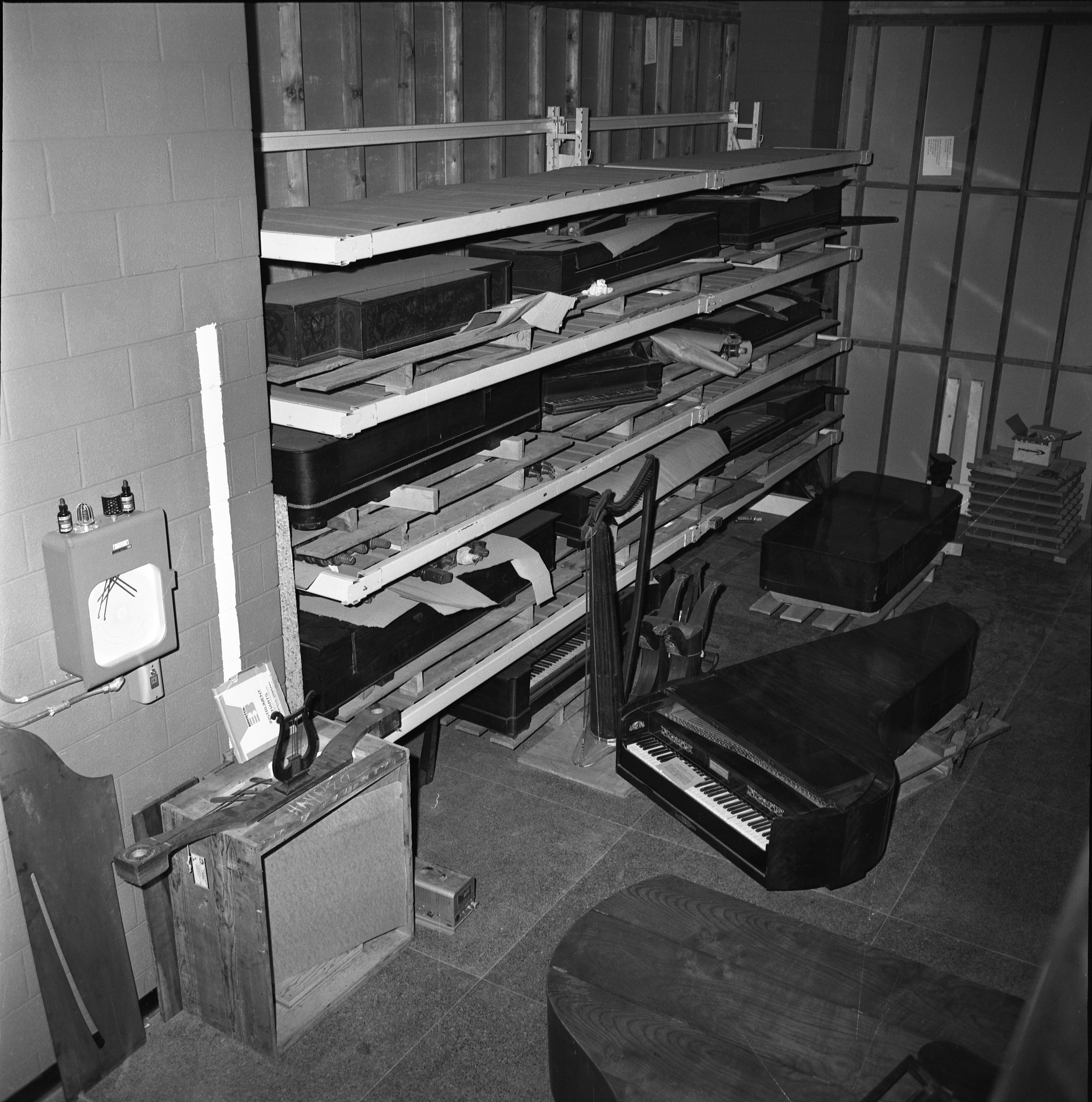 Storage area for the Division of Musical History in the basement of the National Museum of History and Technology, now known as the National Museum of American History.