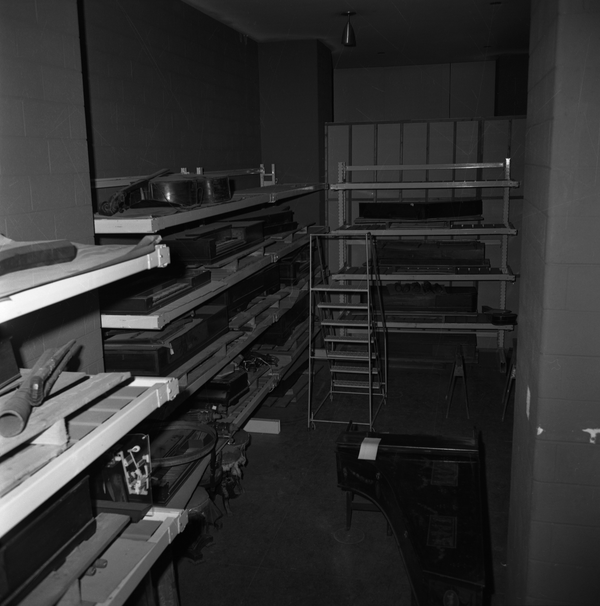 Storage area for the Division of Musical History in the basement of the National Museum of History and Technology, now known as the National Museum of American History.