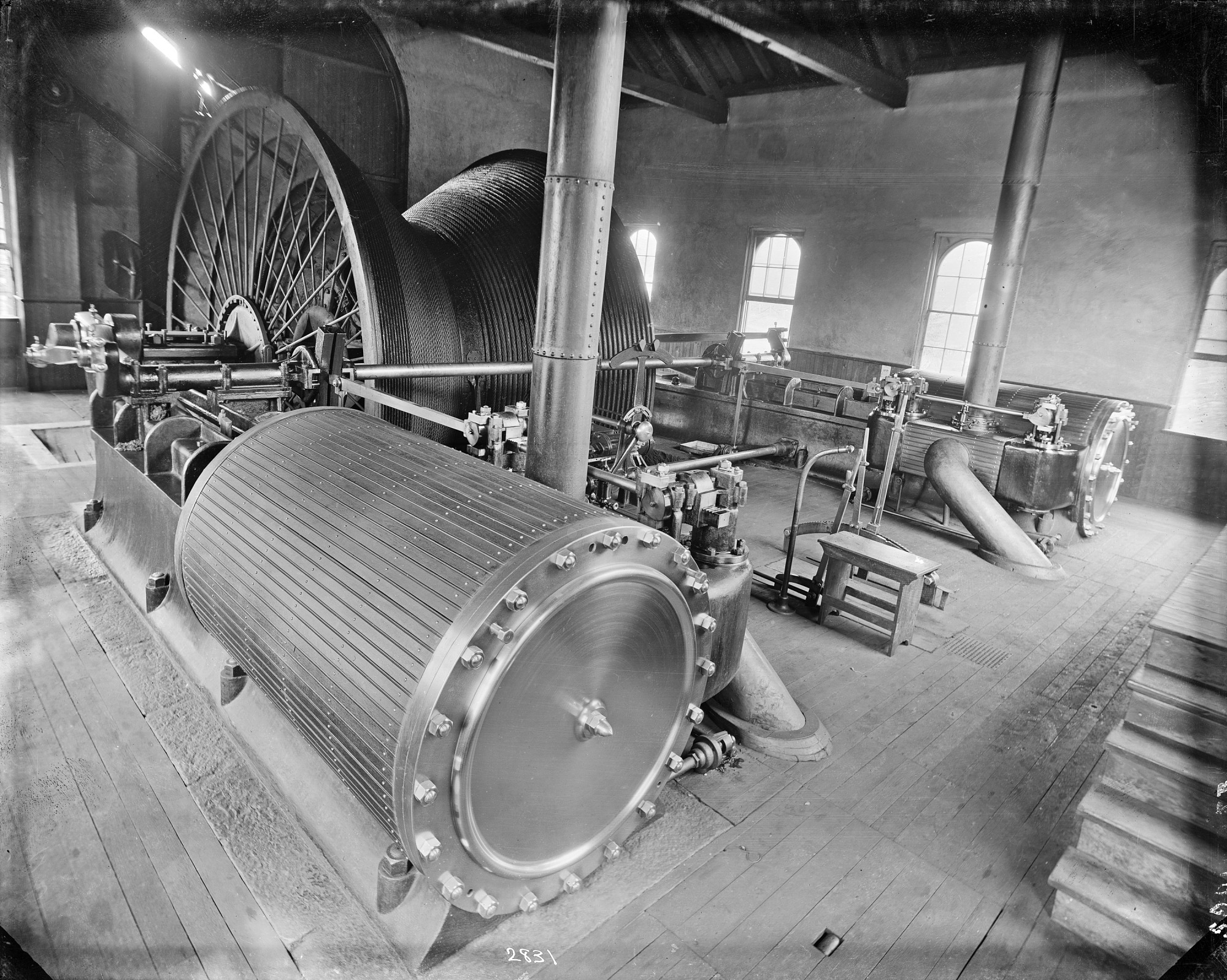 Interior of engine house, showing the deep shaft hoisting engine, cable and drum. The most complete hoisting apparatus in the anthracite coal districts. Deep shaft colliery, Pottsville, Schuylkill County, Pennsylvania.
