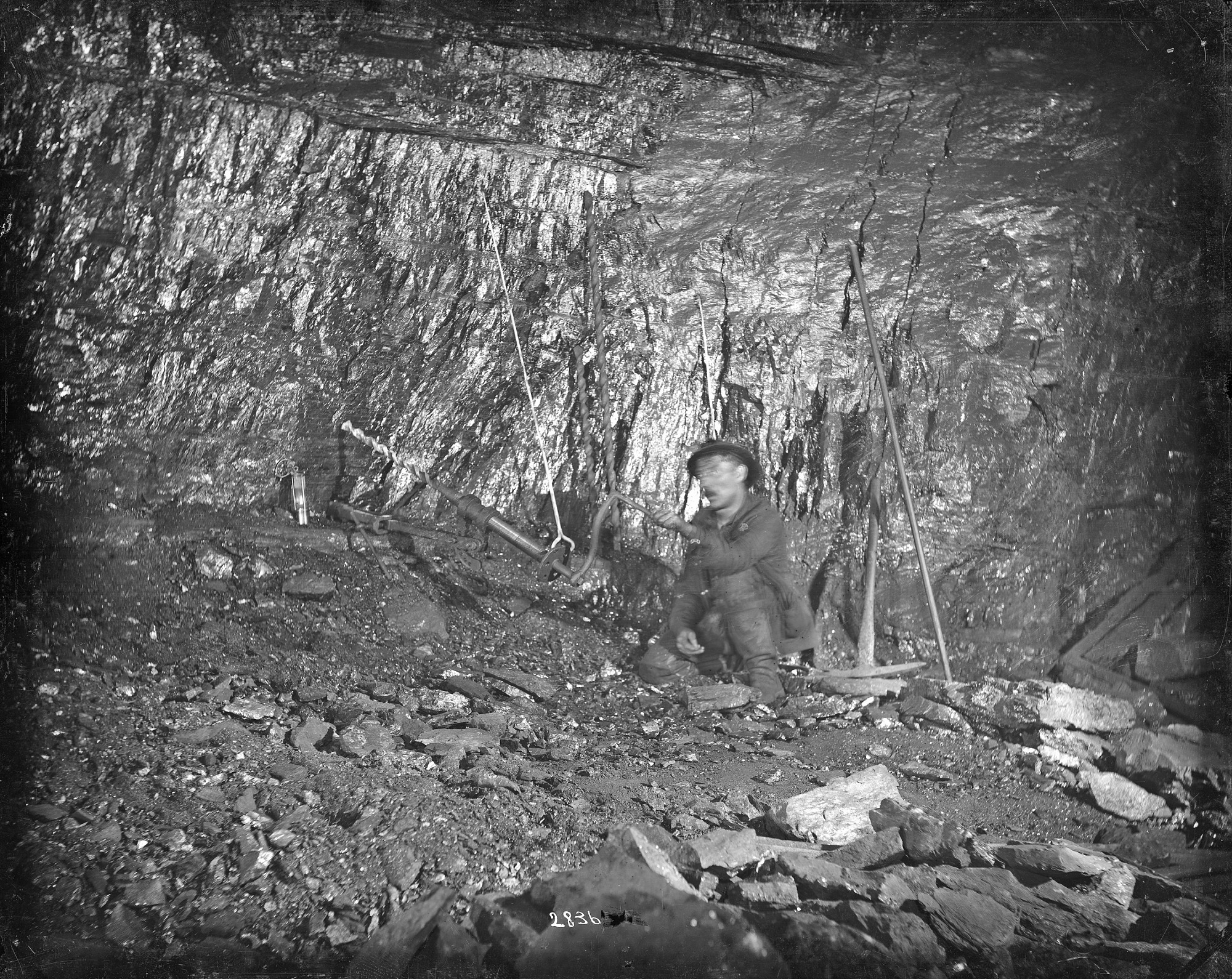 A miner is drilling a hole in the 7-foot bench for a blast with a modern patent drill and by the light of the safety lamp, various tools being grouped about him.