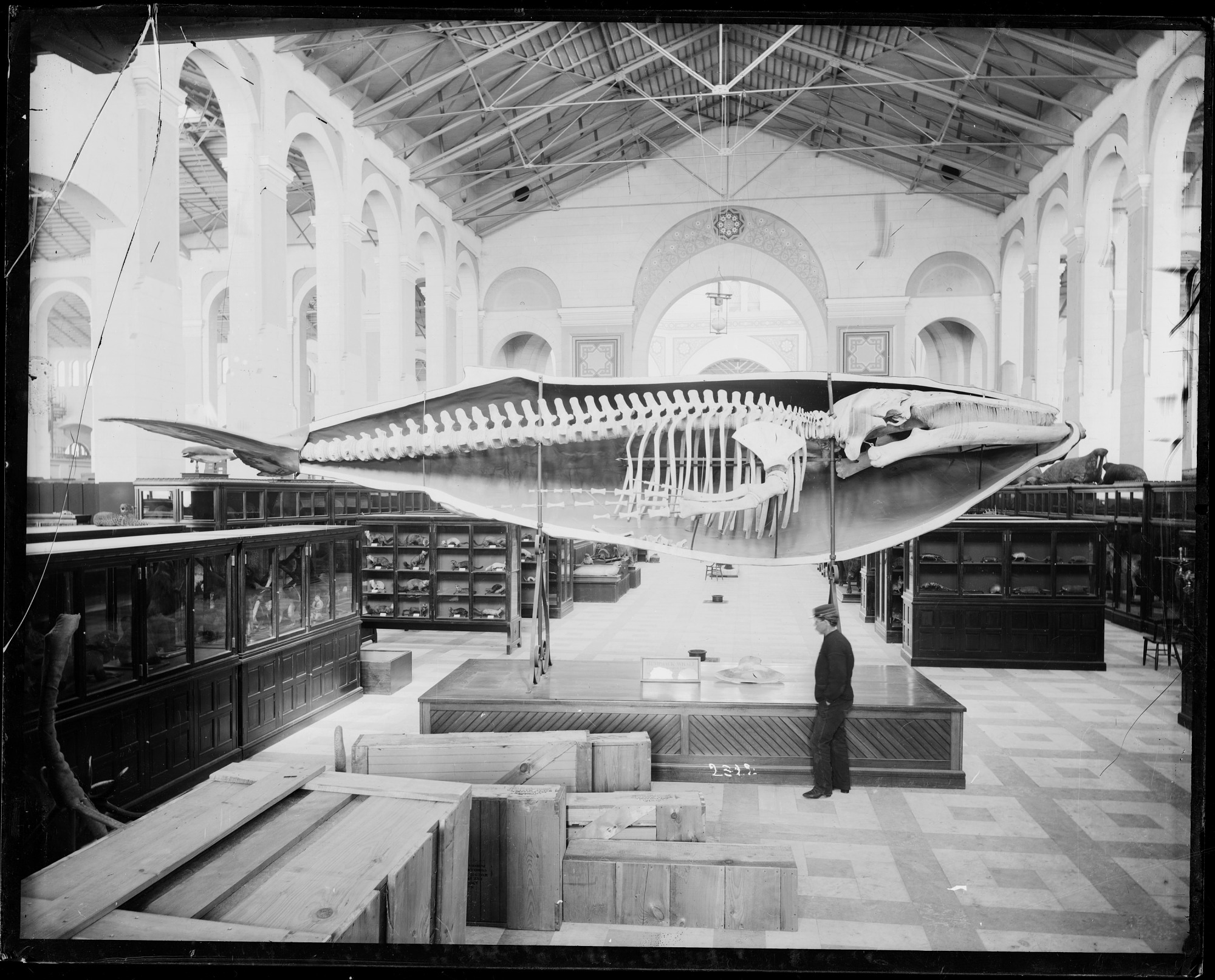 Whale cast in the Mammals exhibit in the South Hall of the United States National Museum (USNM), now known as the Arts and Industries Building, before the 1887 relocation (it was moved from its mount and suspended from ceiling).