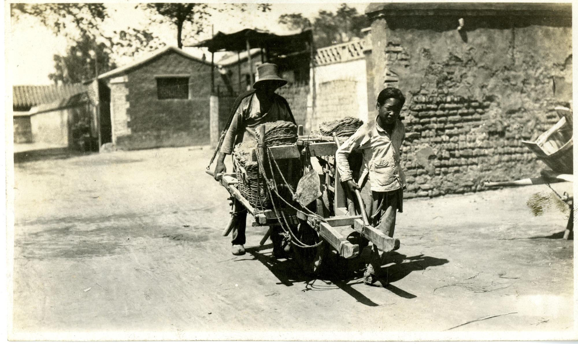 Two people pulling and pushing a cart. Stamp on back reads: Hartung's Photo Shop Peking Legation Street.
