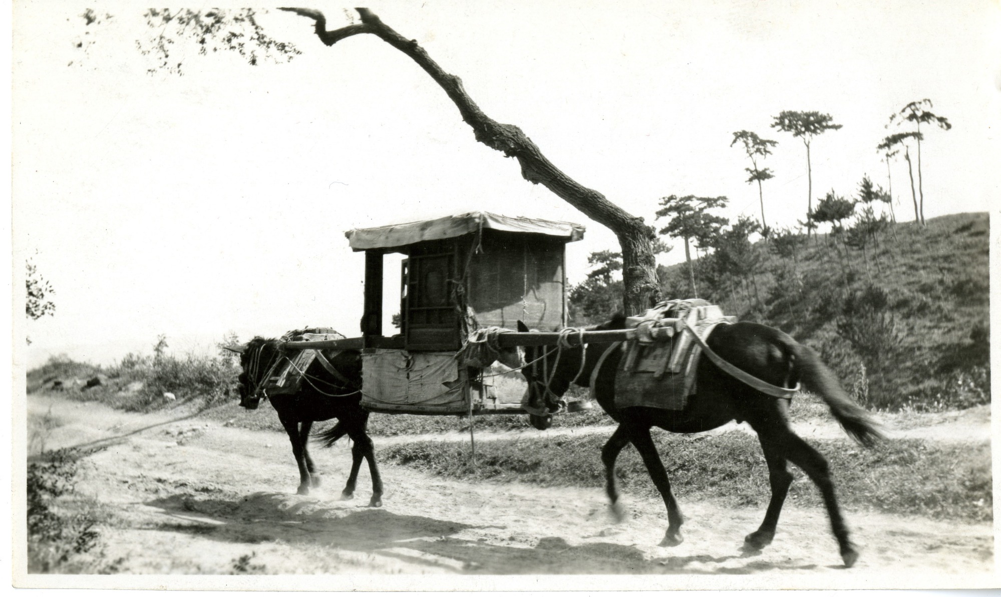 Horses carrying litter. [Stamp on back reads:] Hartung's Photo Shop Peking Legation Street