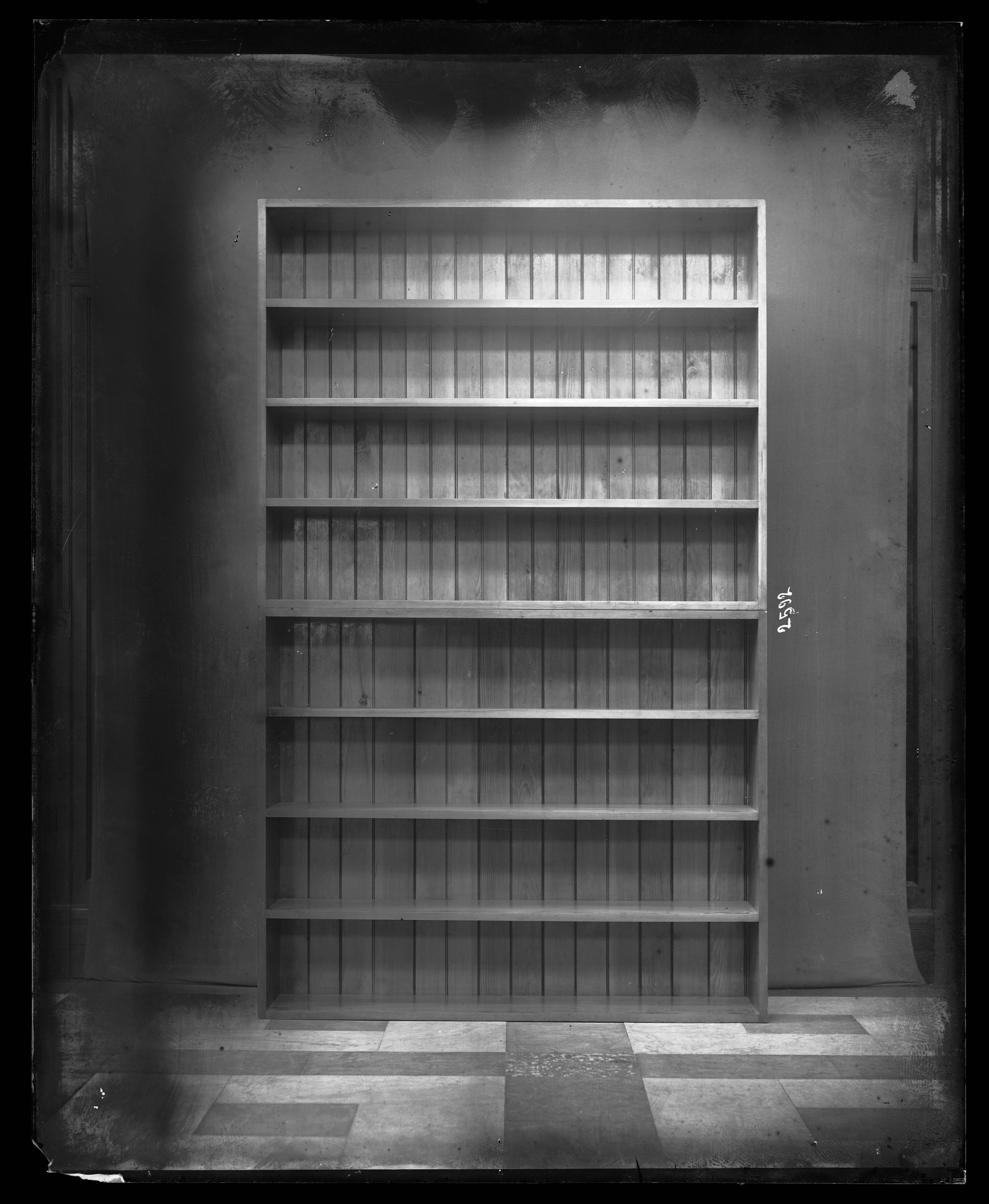 Empty wooden shelves in the United States National Museum, now known as the Arts and Industries Building.