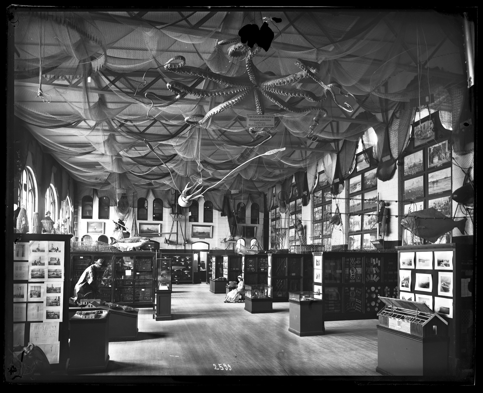 Fisheries exhibit in the northeast range of the United States National Museum, now known as the Arts and Industries Building, with female attendant seated in the center. The wood floors in the building were replaced between 1895 and 1905.