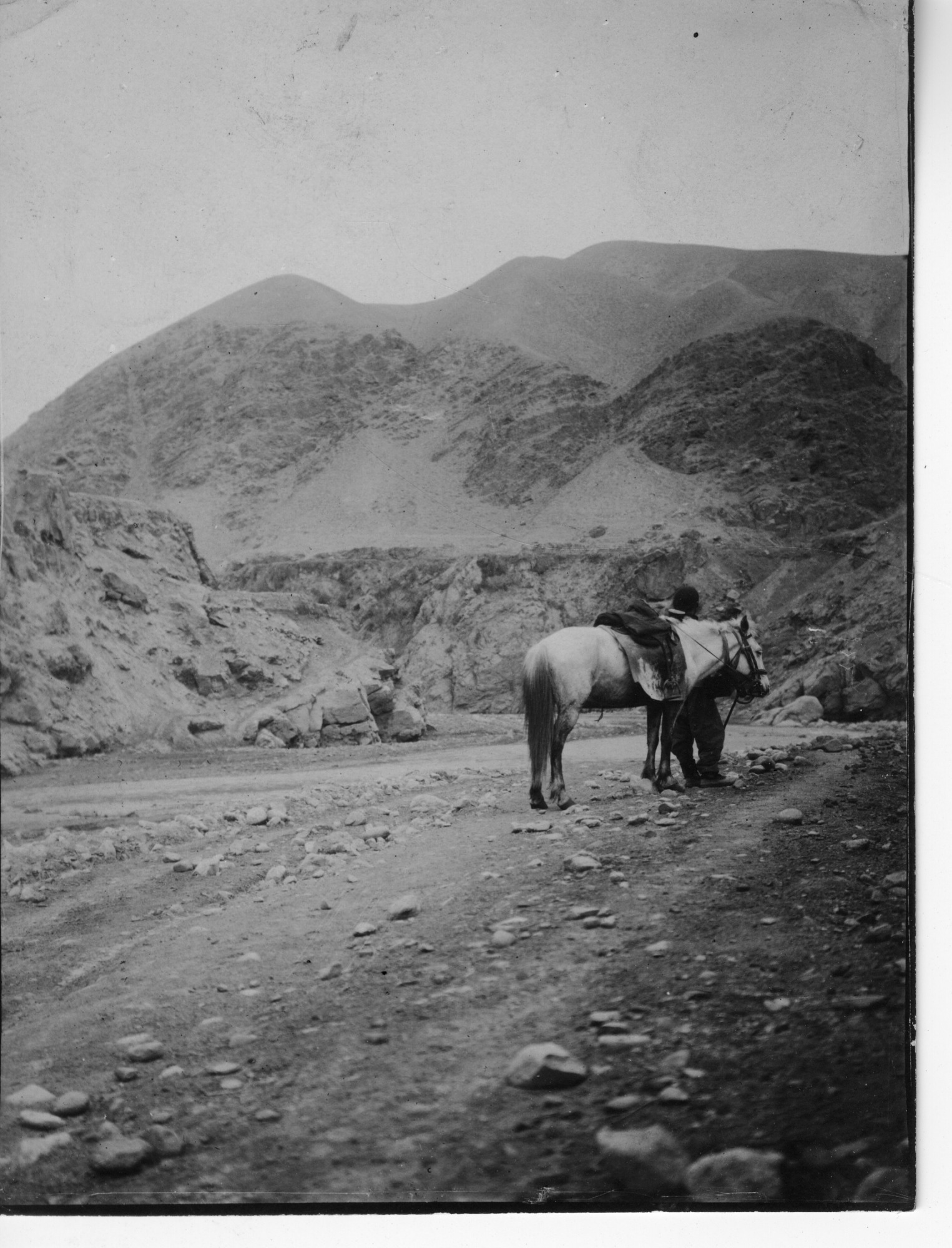The barren hills of northern Shensi [Shaanxi] with horse and dismounted rider