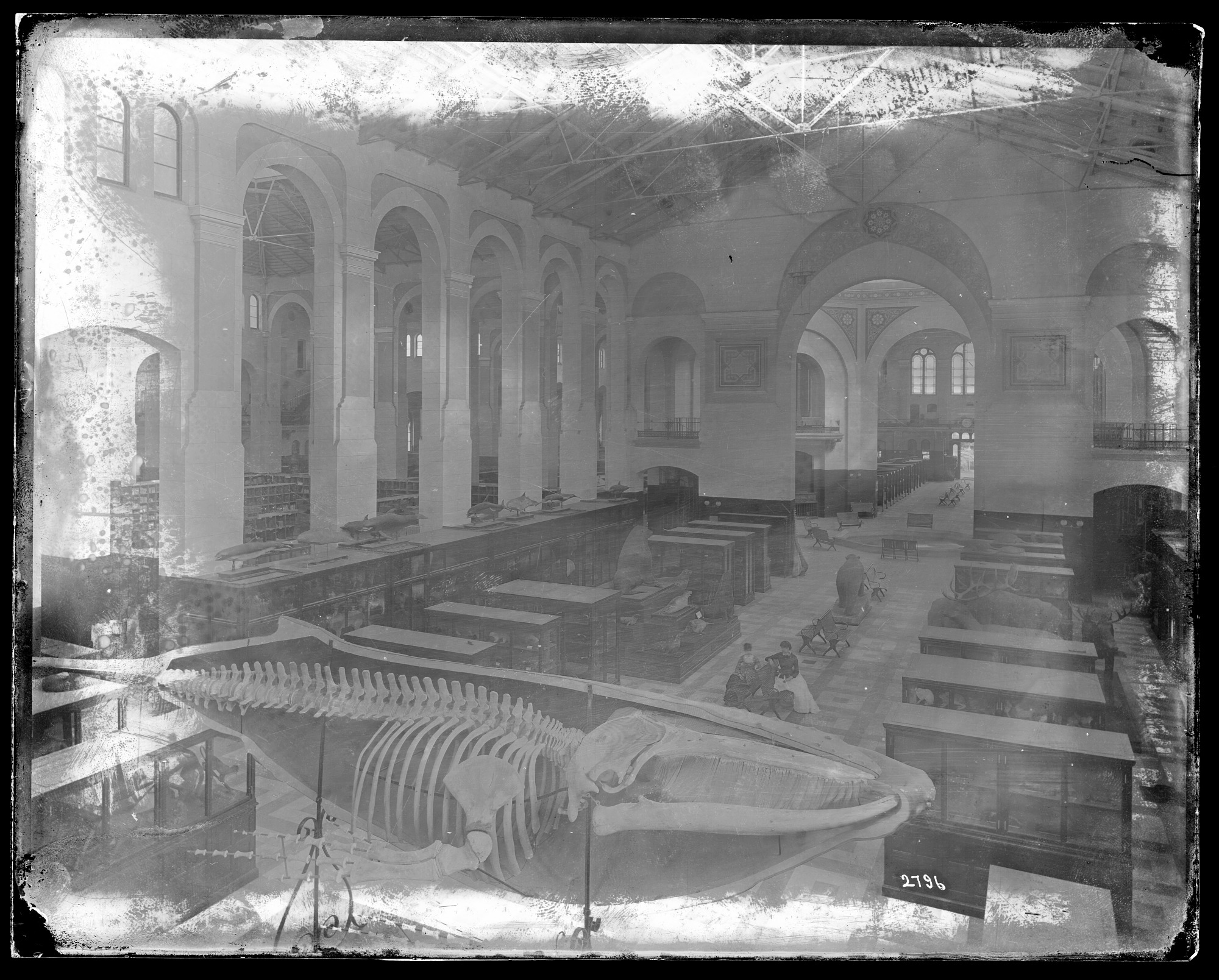 Mammals exhibit in the South Hall of the United States National Museum, now known as the Arts and Industries Building, between 1881-1887. Visible in the foreground is the whale skeleton as it was displayed before it was hung from the ceiling.