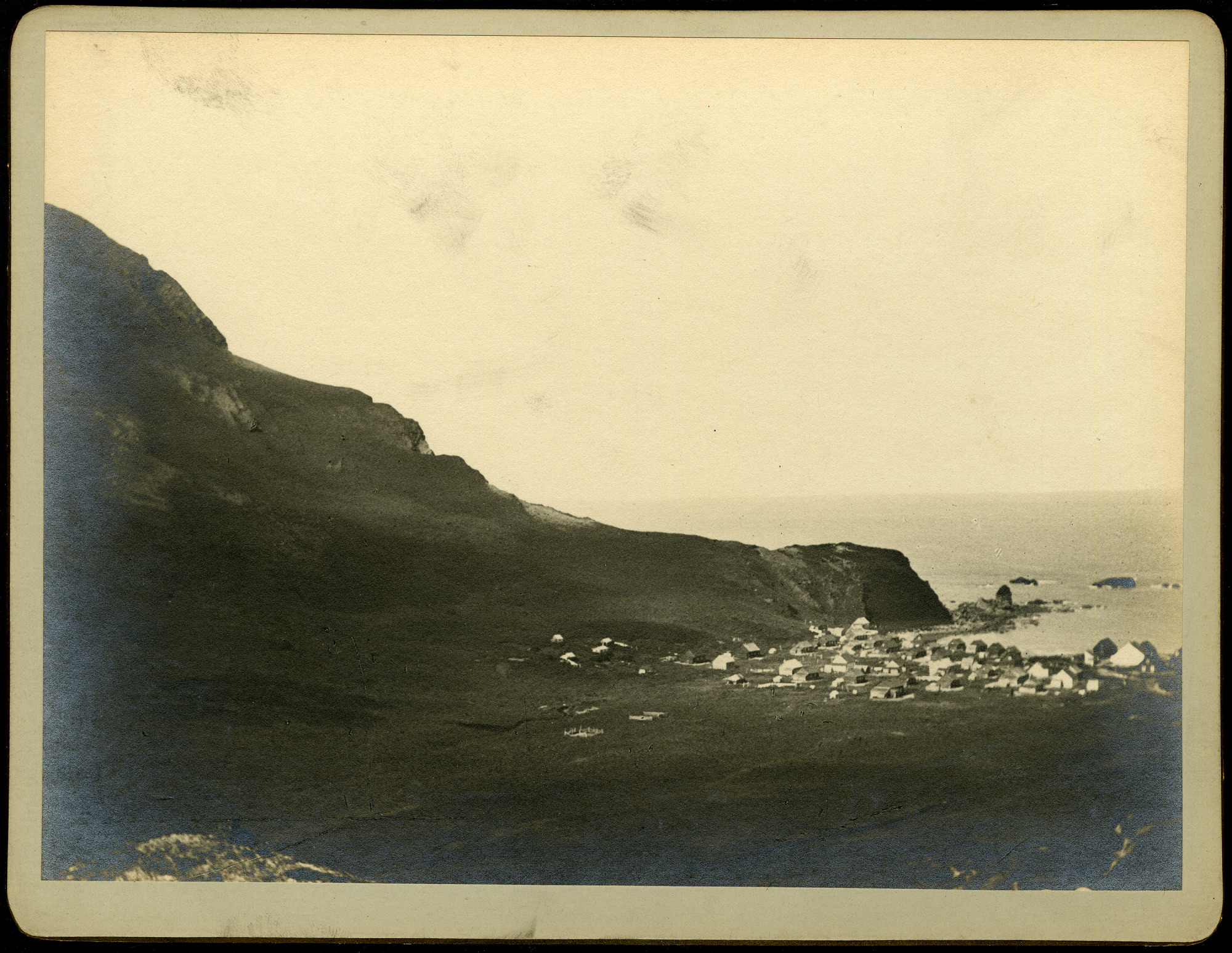 View of town on coast of Ostrov Mednyy, Russia. Photograph was taken during Stejneger's field work for U.S. Bureau of Fisheries.