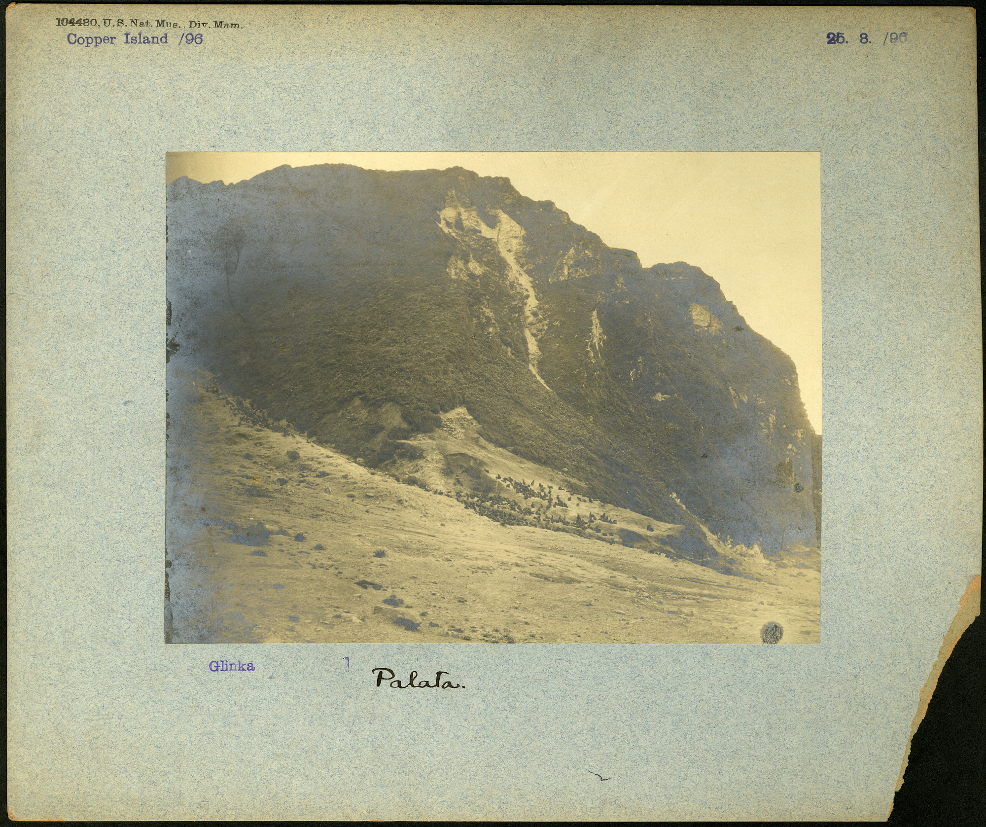Seals in vicinity of cliffs on the coast of Ostrov Mednyy, Russia. Photograph was taken during Stejneger's field work for U.S. Bureau of Fisheries.