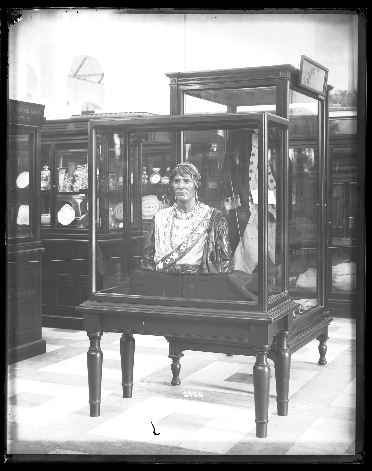 Ethnology exhibits in the United States National Museum, now known as the Arts and Industries Building, featuring exhibit case with bust of Seminole leader Osceola and cases with relics of George Washington in the background.