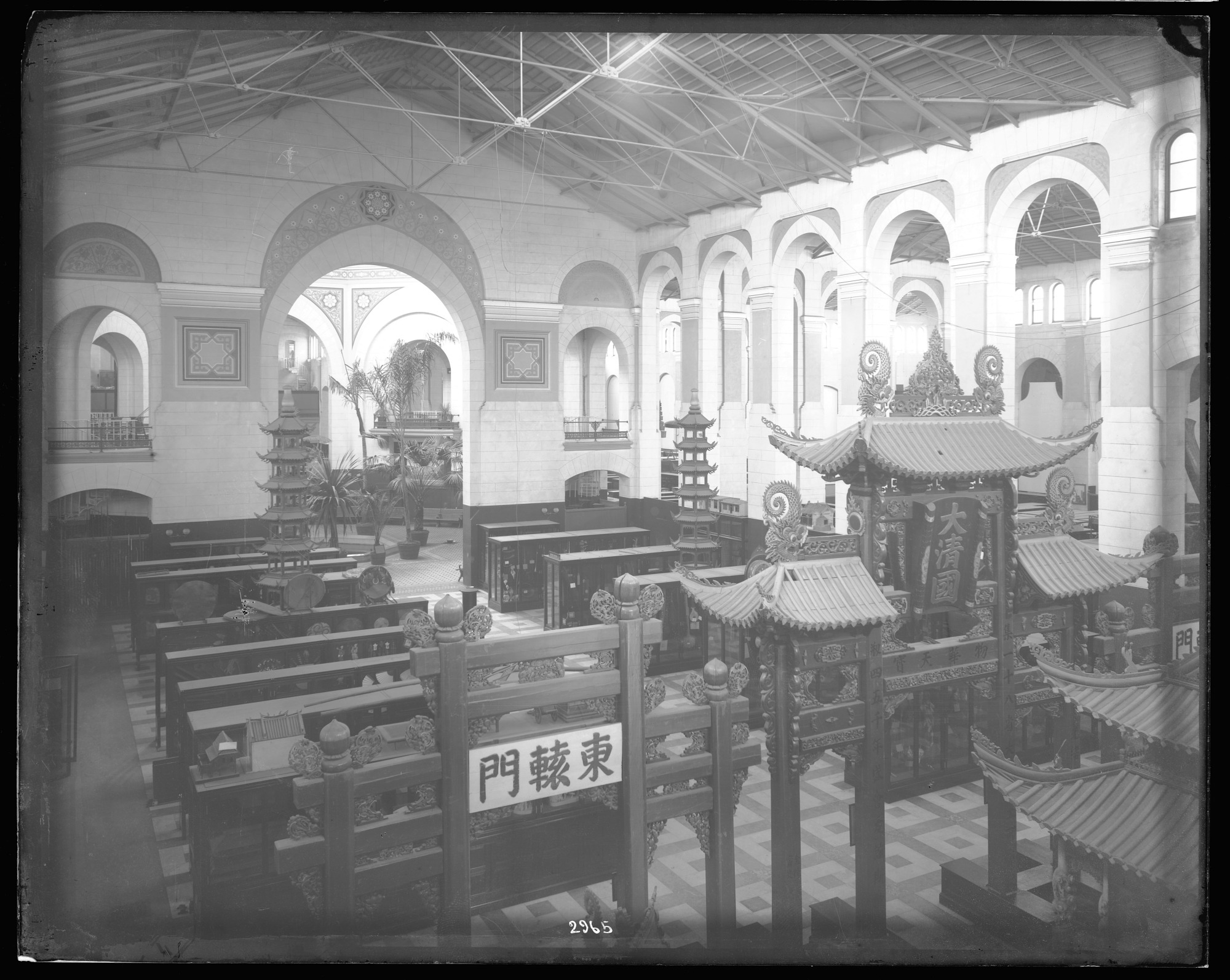 Ethnology exhibits in the United States National Museum, now known as the Arts and Industries Building, featuring the Chinese gateways that stood at the entrance to the Chinese section of the Centennial Exhibition and were presented to the Museum by the Imperial Commissioners.