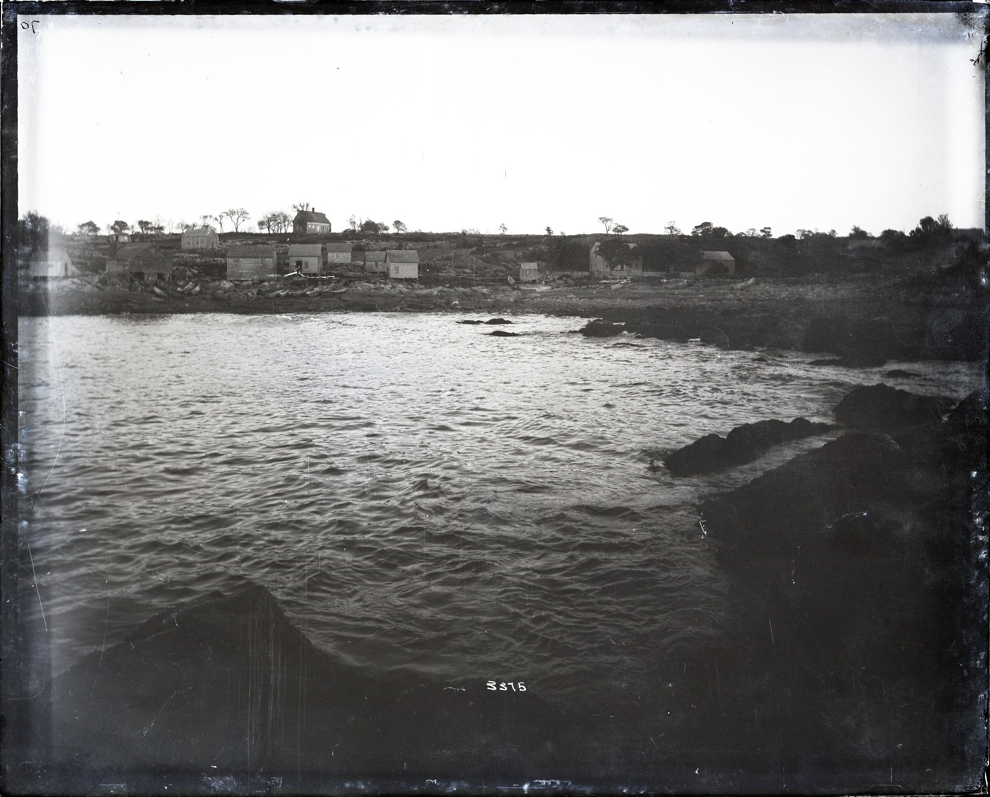 Fishing shacks on shore of unidentified body of water with boats on shore.