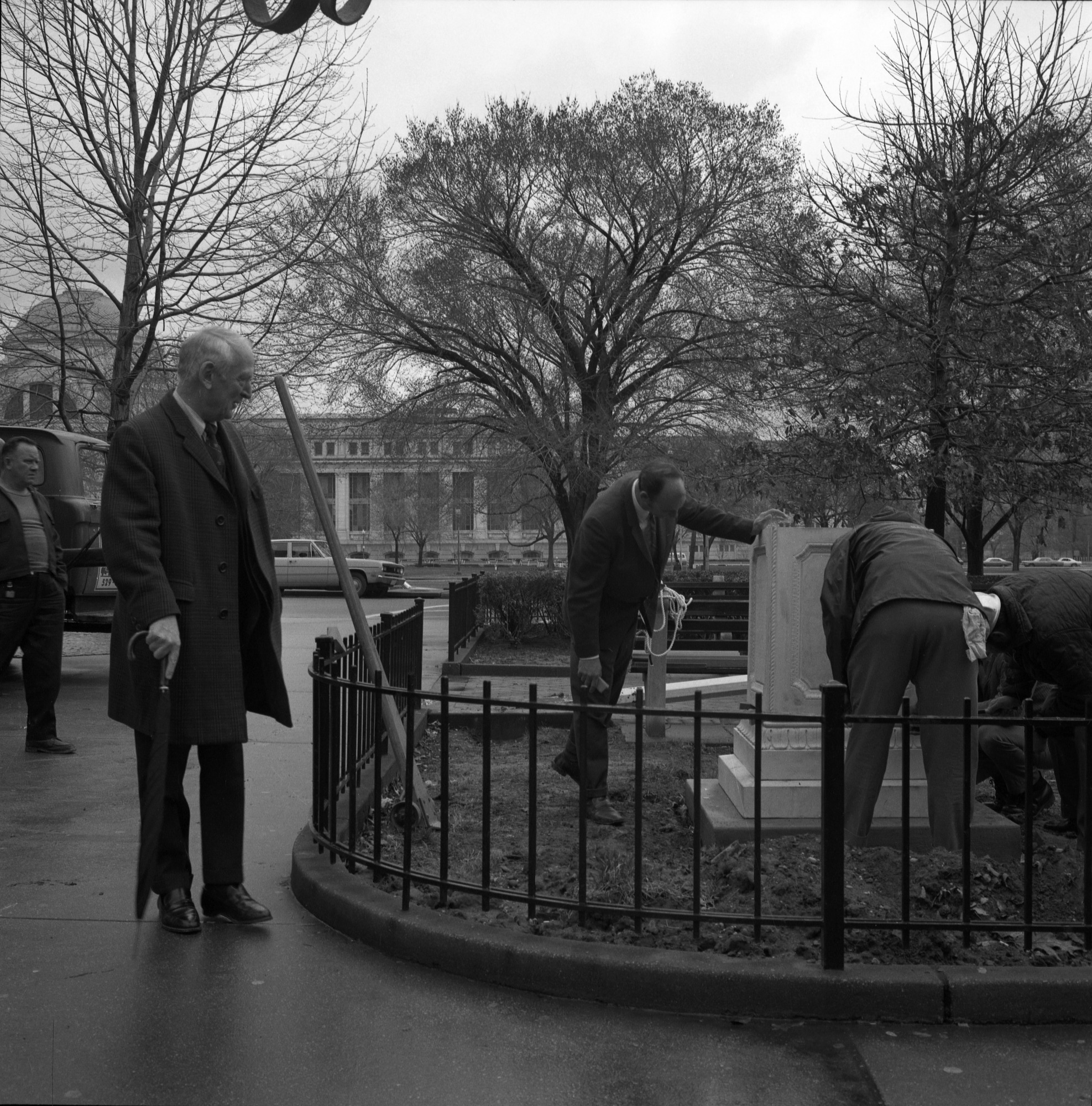 Erection of Andrew Jackson Downing memorial urn at the east entrance of the Smithsonian Institution Building, or Castle.