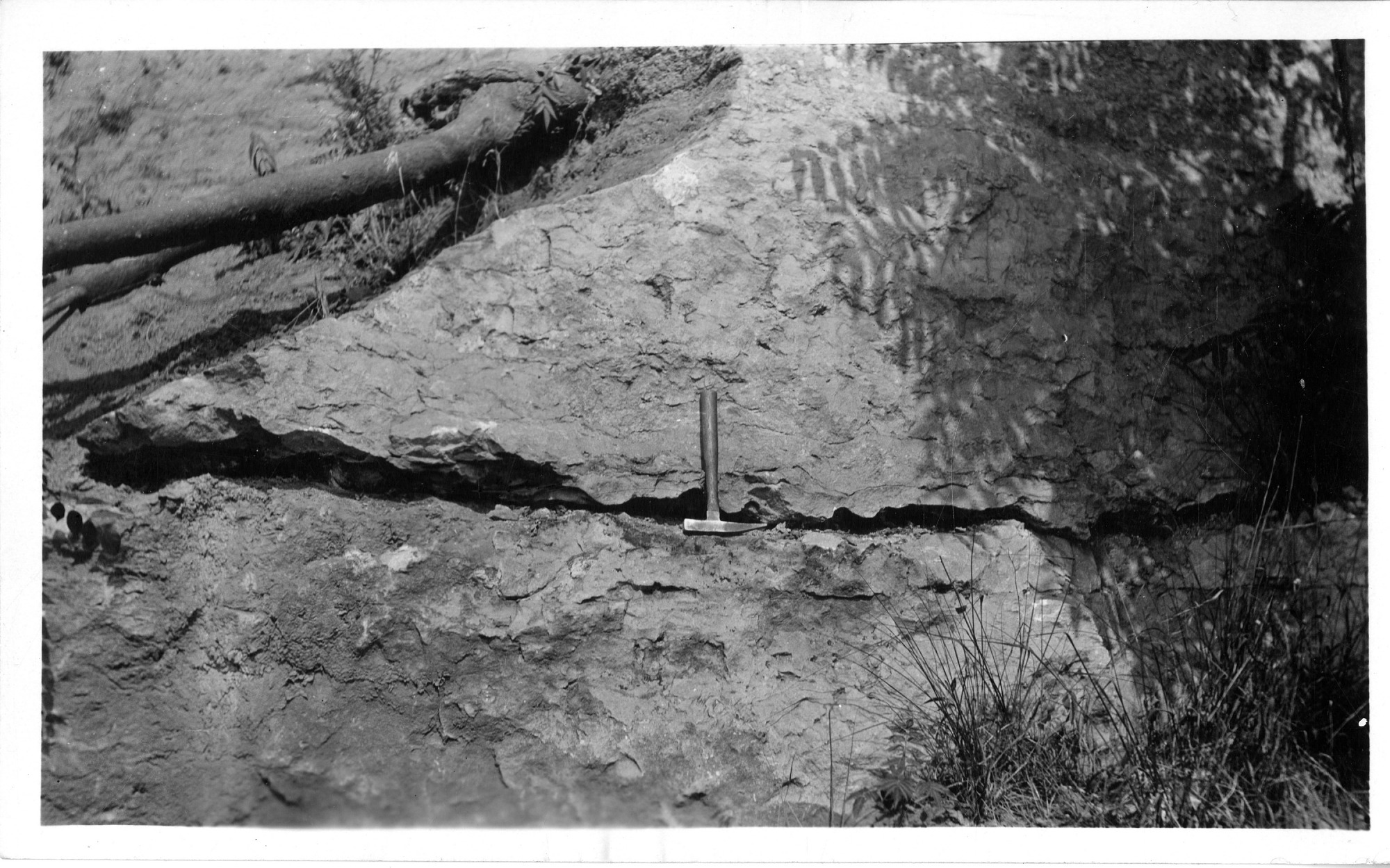Contact - Keuimswien Auestone (below) and early Triarten Echinospharites bed (above). North Main Street, Cape Girardean, June 9, 1932