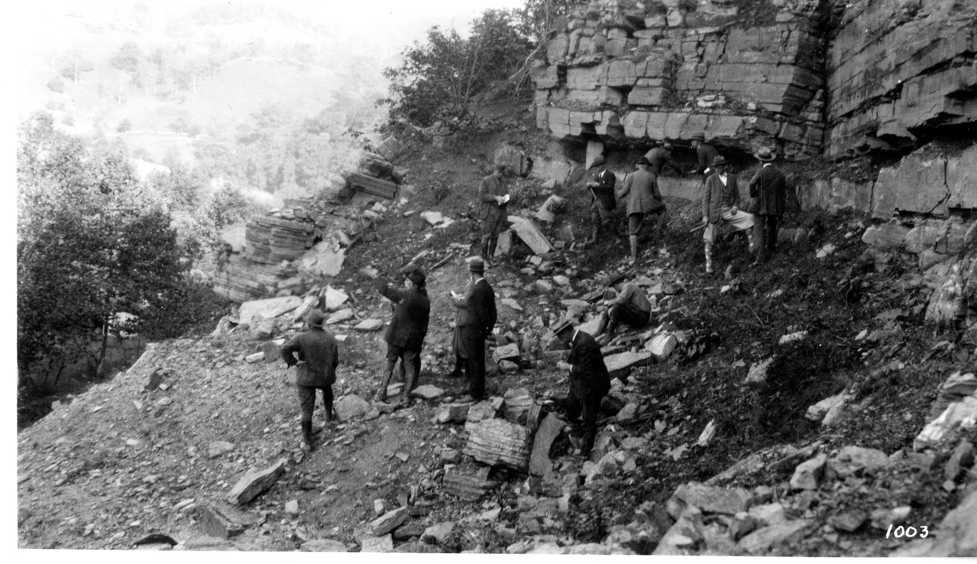 Unidentified men standing amid rocks