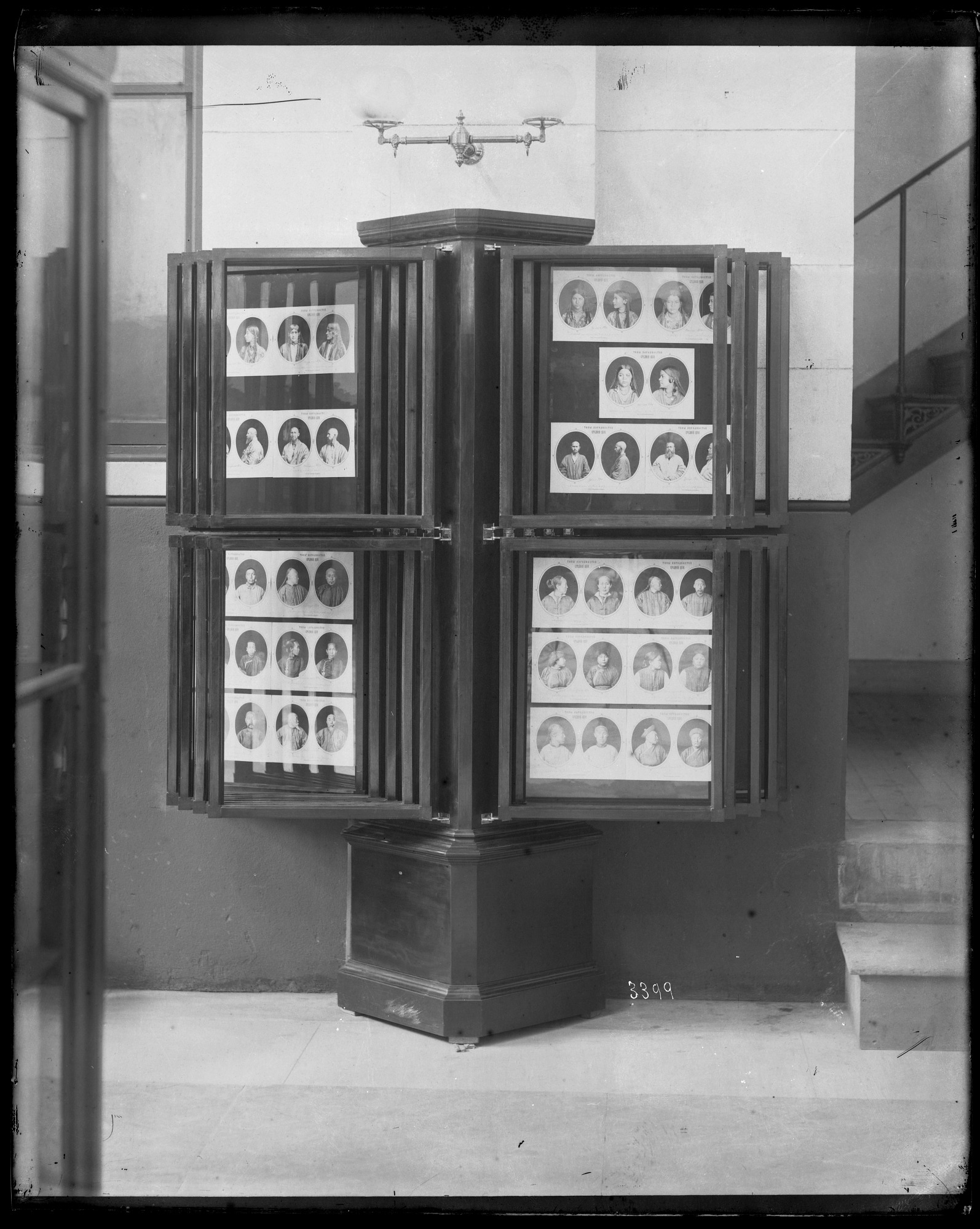 Swing panel exhibit case featuring front facing and profile portraits of people representing different cultures as part of ethnology exhibits in the United States National Museum, now known as the Arts and Industries Building.