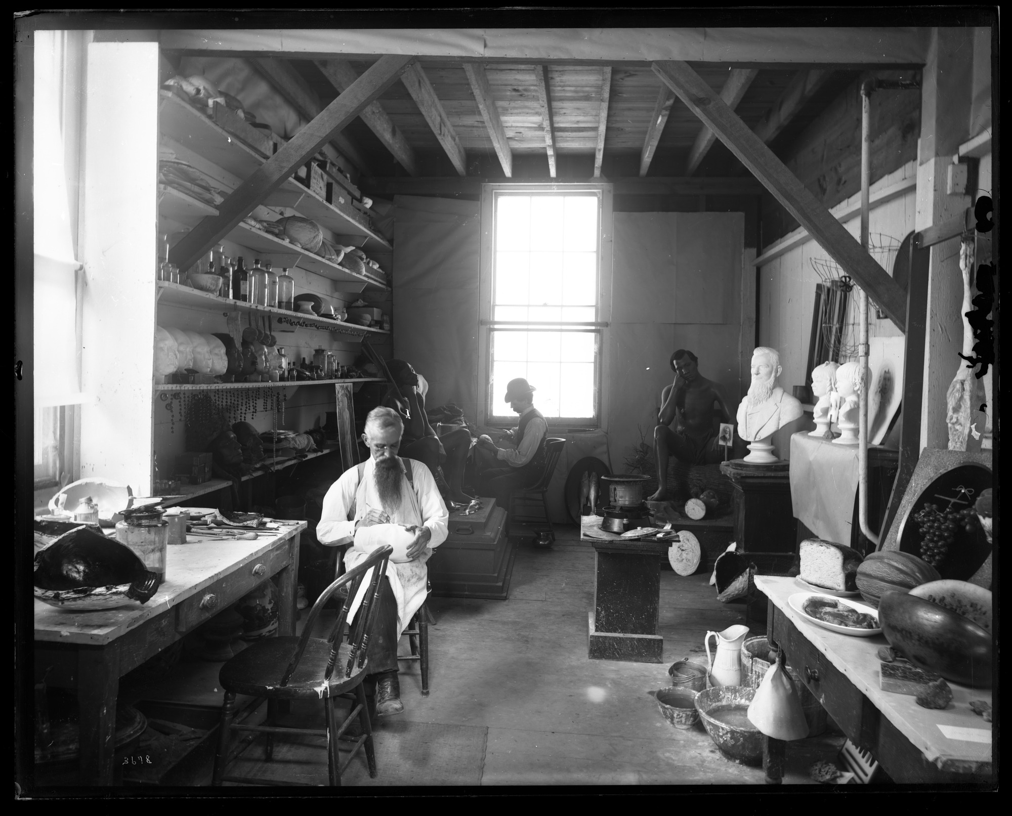 Sculptor John W. Hendley in the first floor modeler's studio of the temporary shed, with a wax model of a taxidermist near the window.
