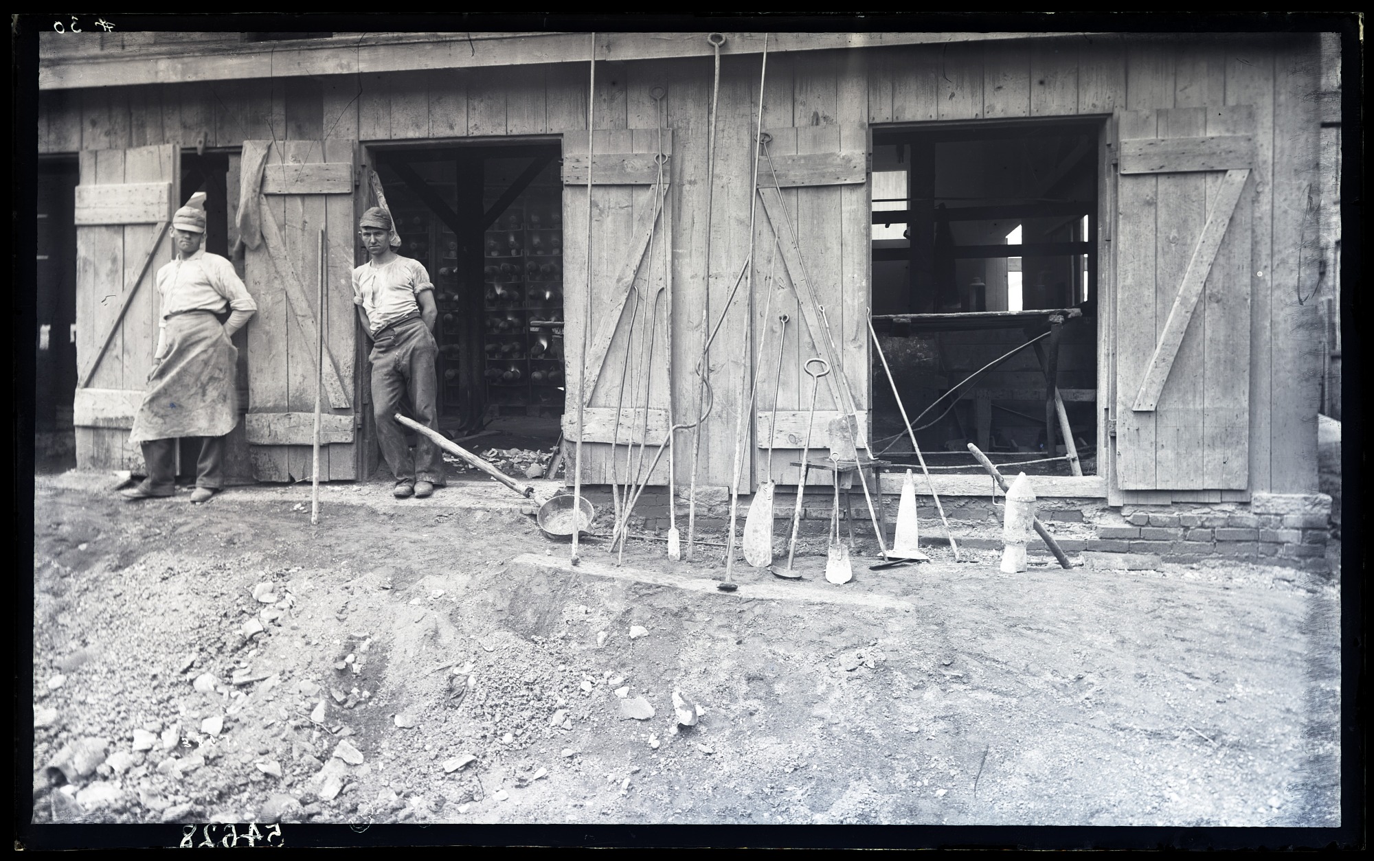 Exterior view of Passaic Zinc Company, Jersey City, New Jersey, with spelter smelting in Belgian furnaces in view in the background.