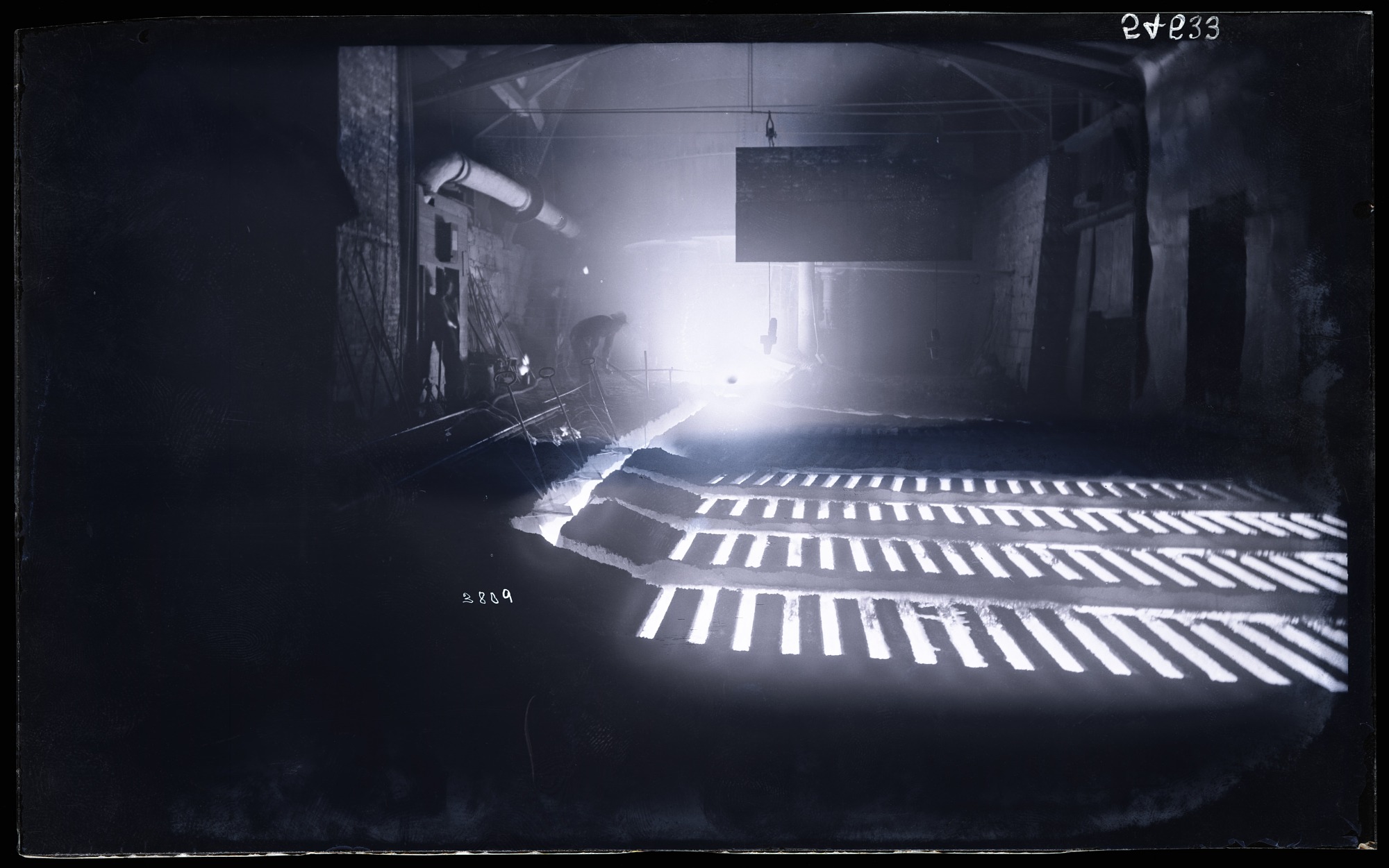 Casting-house floor of charcoal blast furnace, showing beds of molten cast-iron that has just been tapped from the furnace and cast into pigs.
