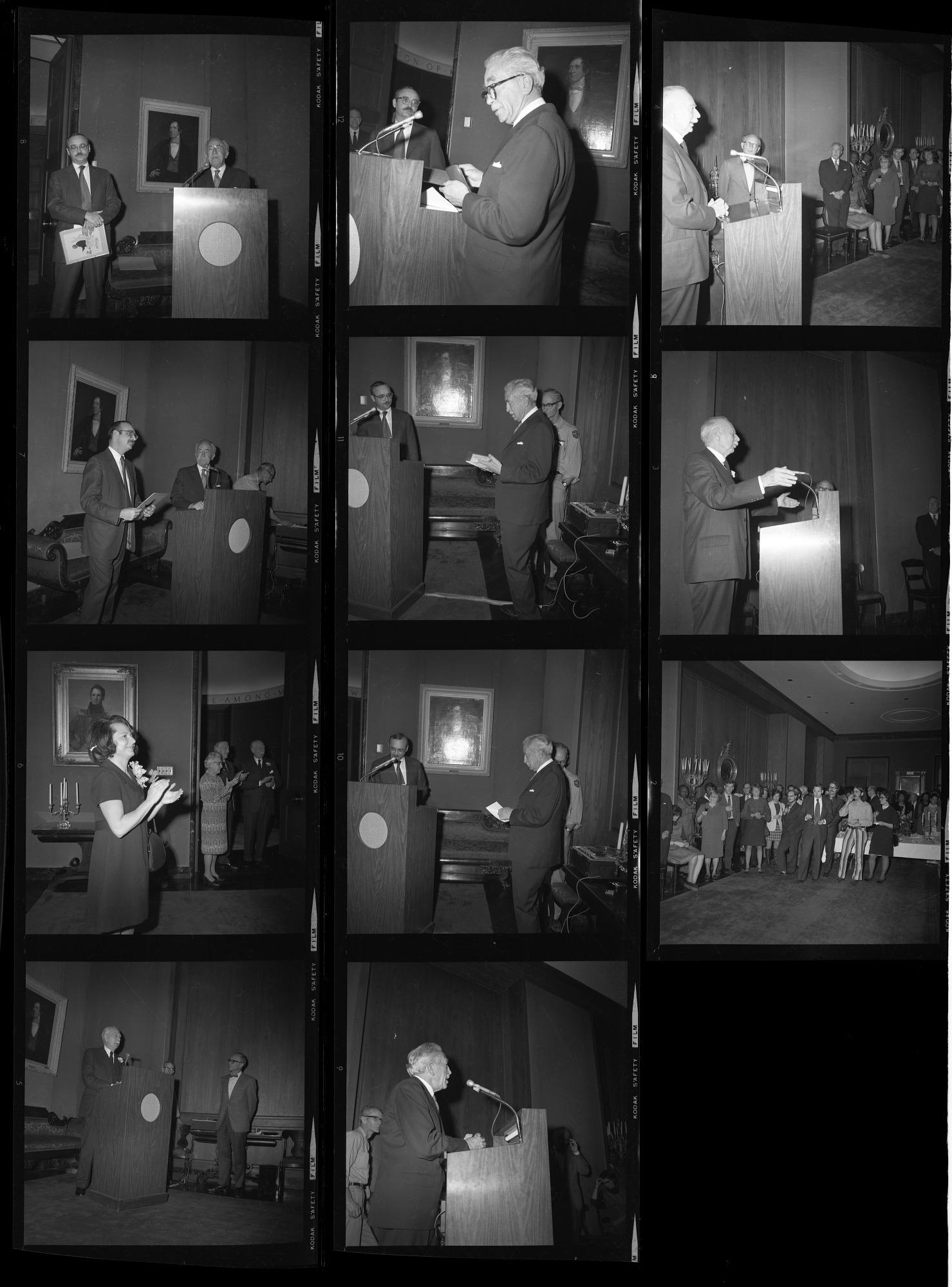 Reception for the retirement of Dr. Philip W. Bishop, curator in the Division of Manufacturing at the National Museum of History and Technology, now known as the National Museum of American History, with Leonard Carmichael, seventh Smithsonian Secretary, and John H. White, curator in the Division of Transportation in the Department of Industries.