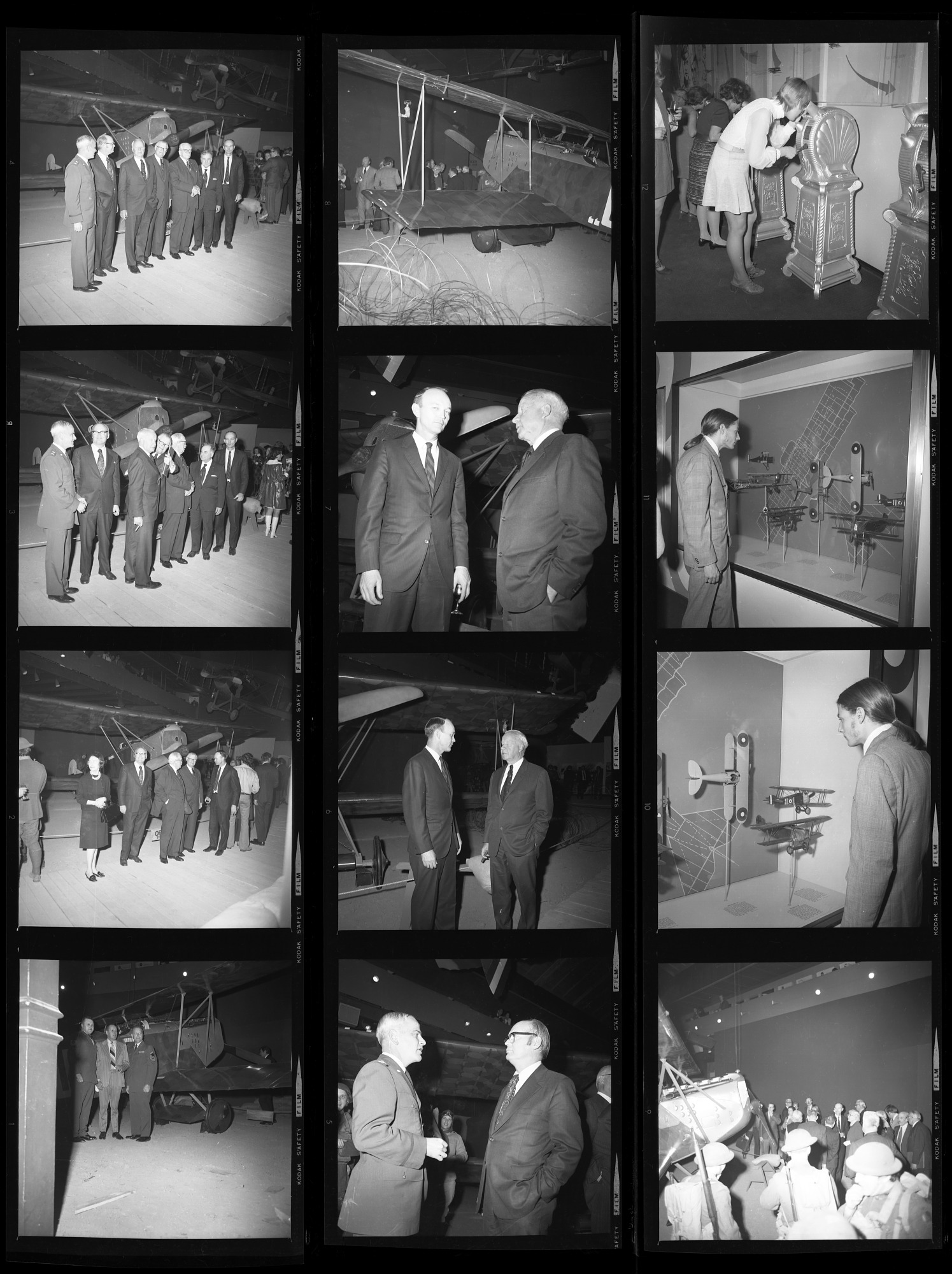 Preview opening of "World War I Aviation" exhibit for the National Air and Space Museum (NASM) at the Arts and Industries Building, with Michael Collins, NASM Director, and Paul E. Garber, NASM historian emeritus.