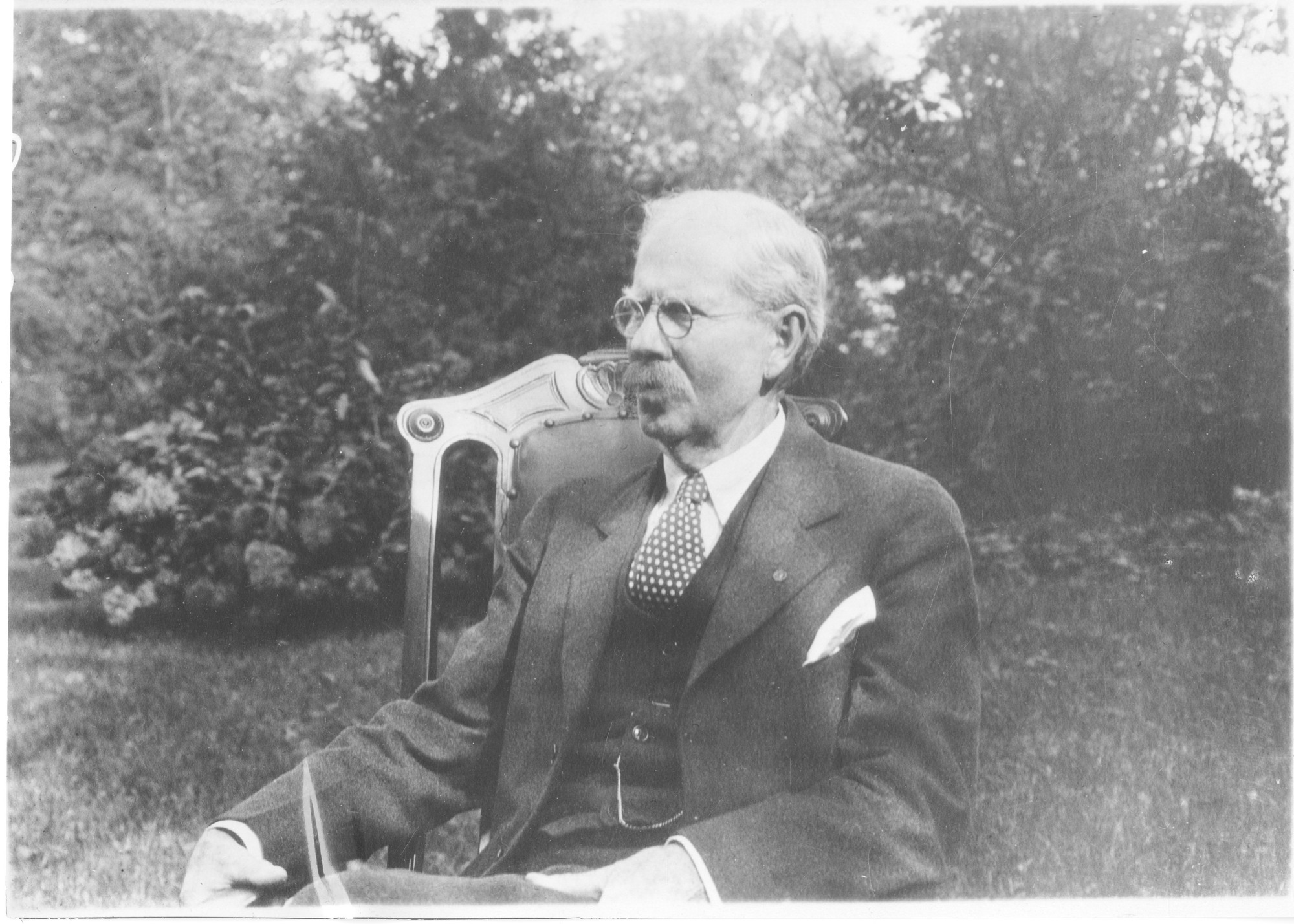 Robert Ridgway (1850-1929) is sitting outdoors in a chair. Ridgway was an ornithologist and the first full-time curator of birds at the Smithsonian Institution.