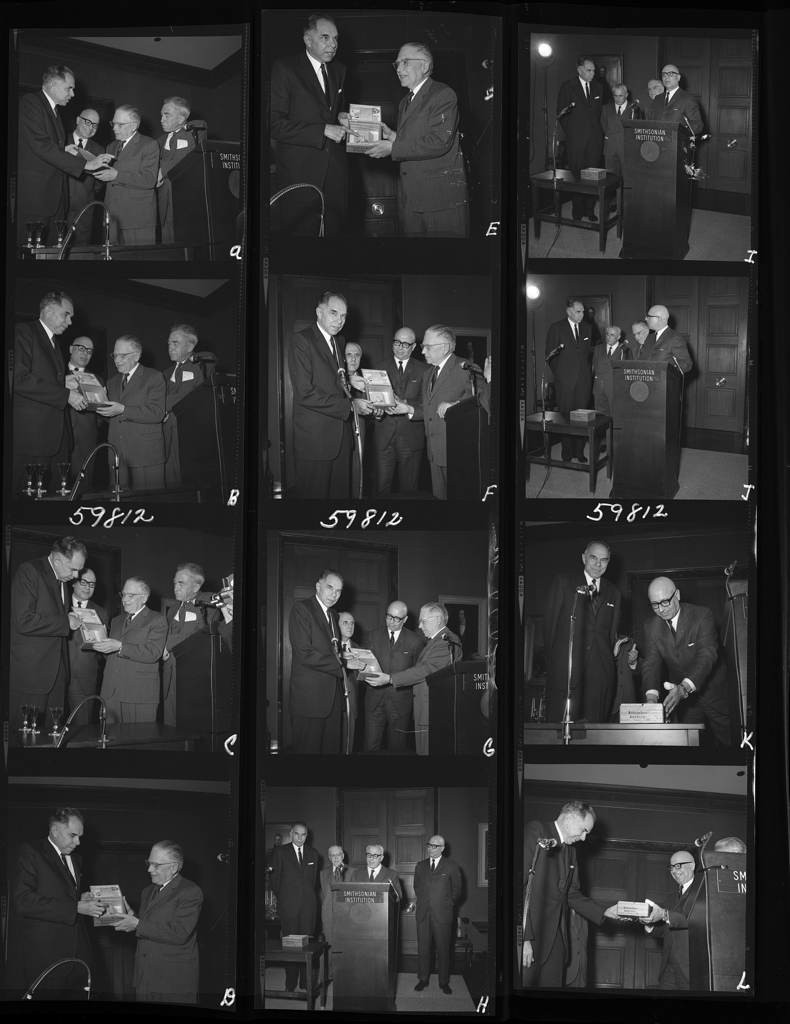 Presentation of Plutonium-239 by chemist Dr. Glenn T. Seaborg and physicist Dr. Emilio G. Segrè to the Museum of History and Technology, now known as National Museum of American History, with Sidney R. Galler, Assistant Secretary for Science.
