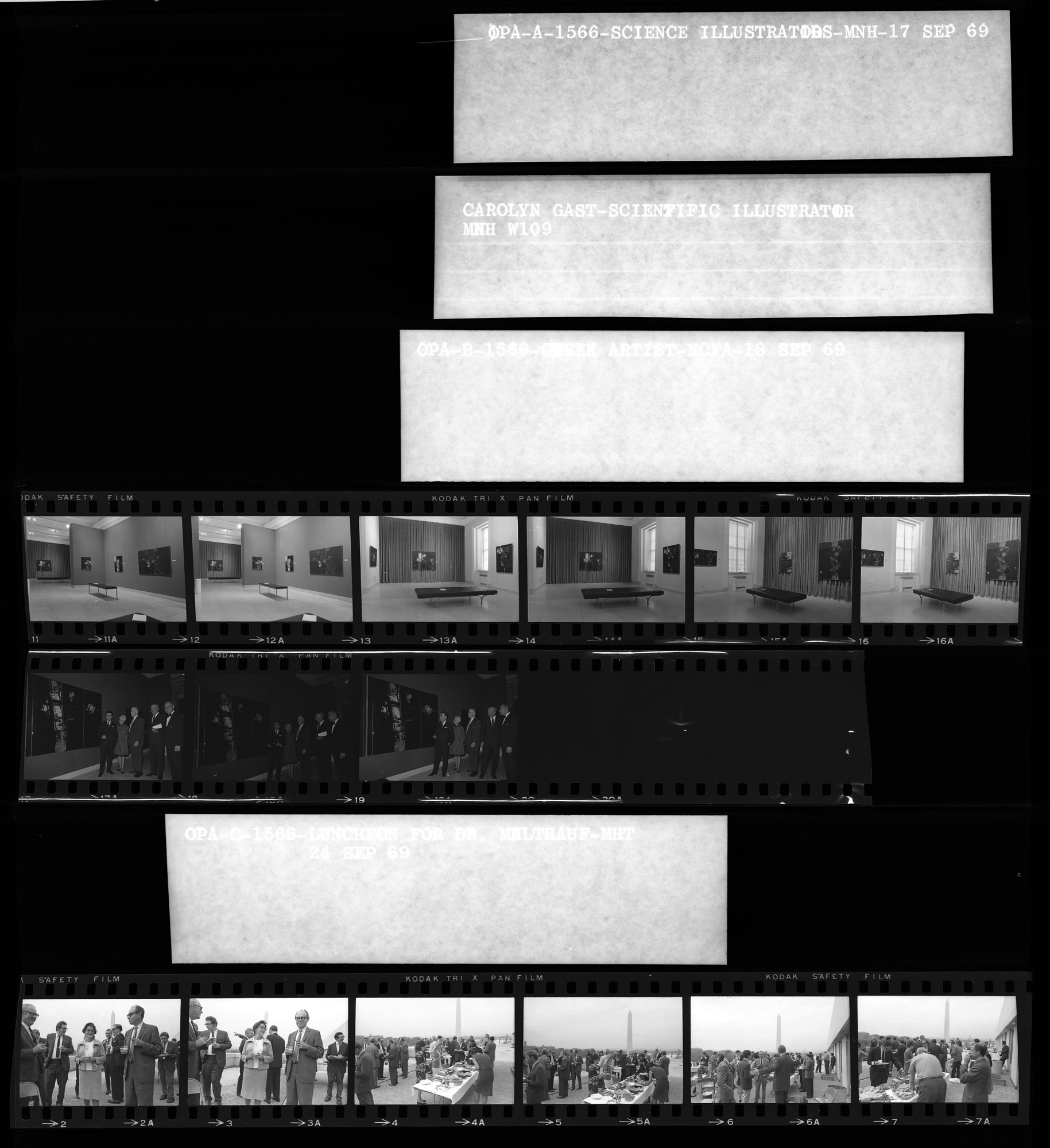 Artist Yiannis Spyropoulos and wife Zoe Margariti Spyropoulos visit his exhibition of modern paintings at National Collection of Fine Arts (NCFA), September 18, 1969. ; Luncheon on the rooftop terrace of National Museum of History and Technology (NMHT) for Robert P. Multhauf, senior scientific advisor at NMHT, September 24, 1969.