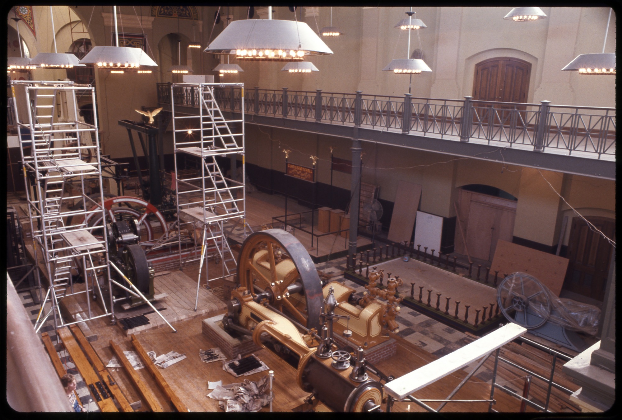 Installation of Machinery Hall for "1876: A Centennial Exhibition" in the west gallery of the Arts and Industries Building during renovation.
