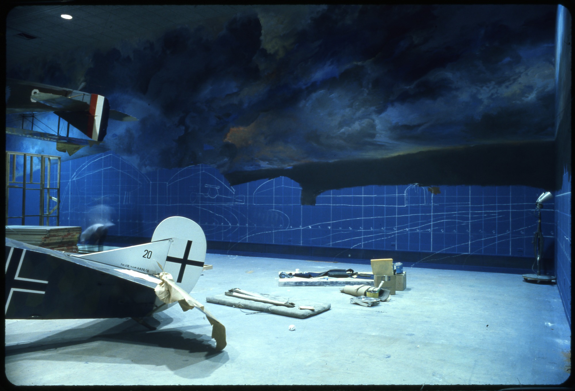 Installation of World War I Gallery at the National Air and Space Museum, with partial mural in background.