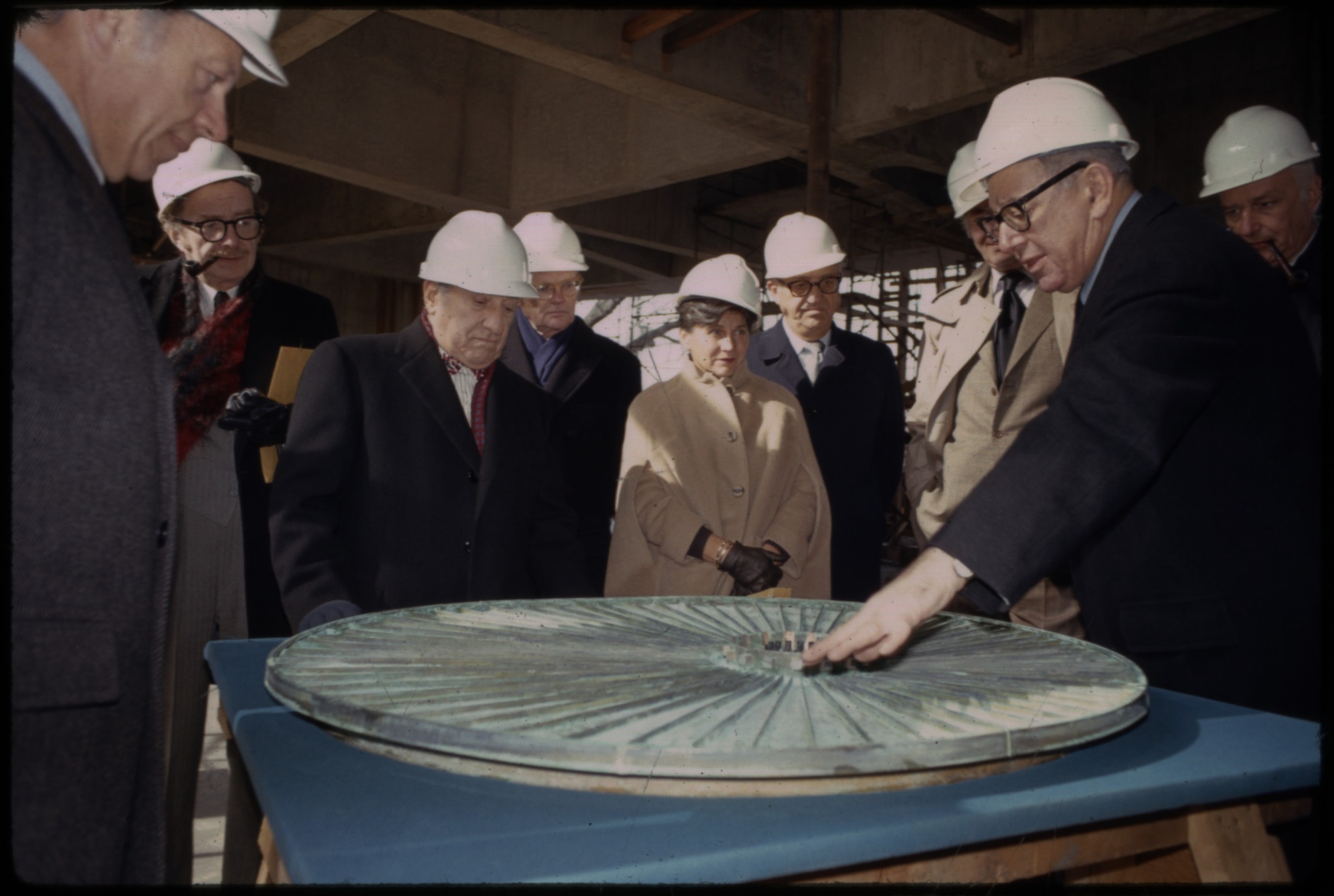 Progress shots of the construction of the Hirshhorn Museum and Sculpture Garden, with Hirshhorn Building Committee, and Joseph and Olga Hirshhorn.