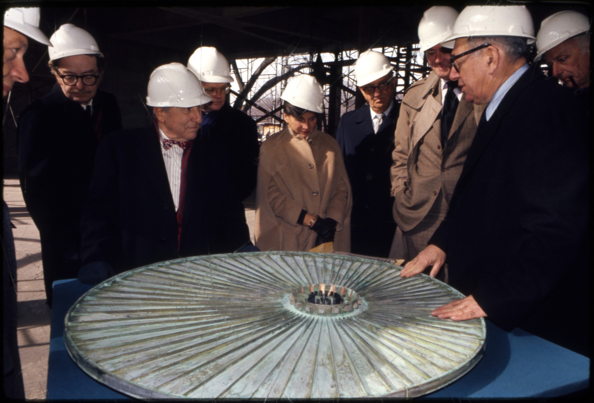 Progress shots of the construction of the Hirshhorn Museum and Sculpture Garden, with Hirshhorn Building Committee, and Joseph and Olga Hirshhorn.