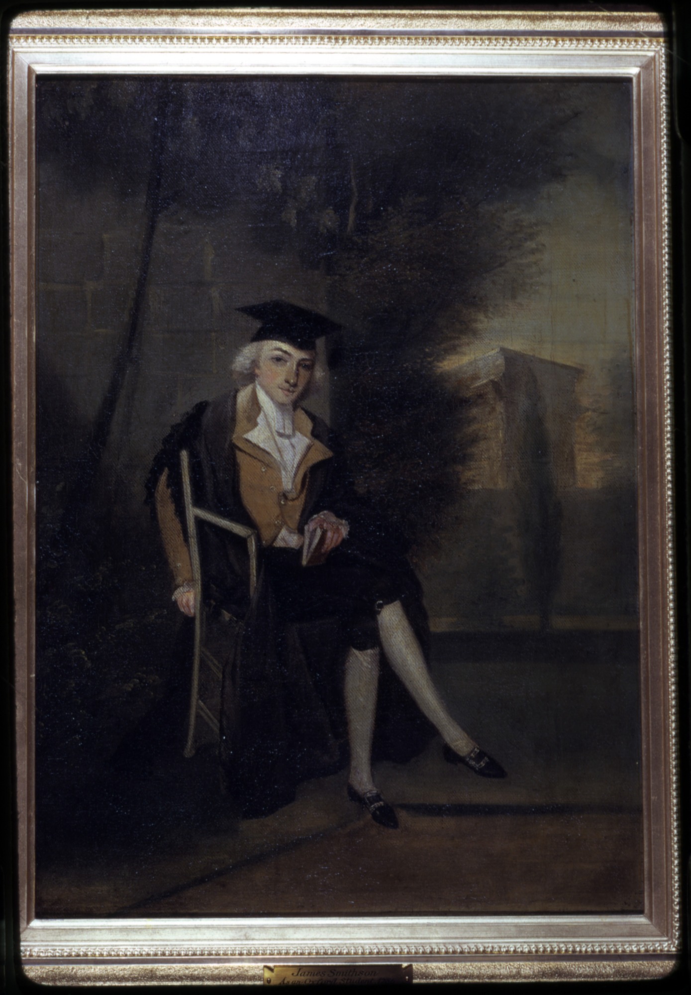 Oil on canvas painting by James Roberts, 1786. Depicting James Smithson in cap and gown, while a student at Pembroke College, Oxford.
