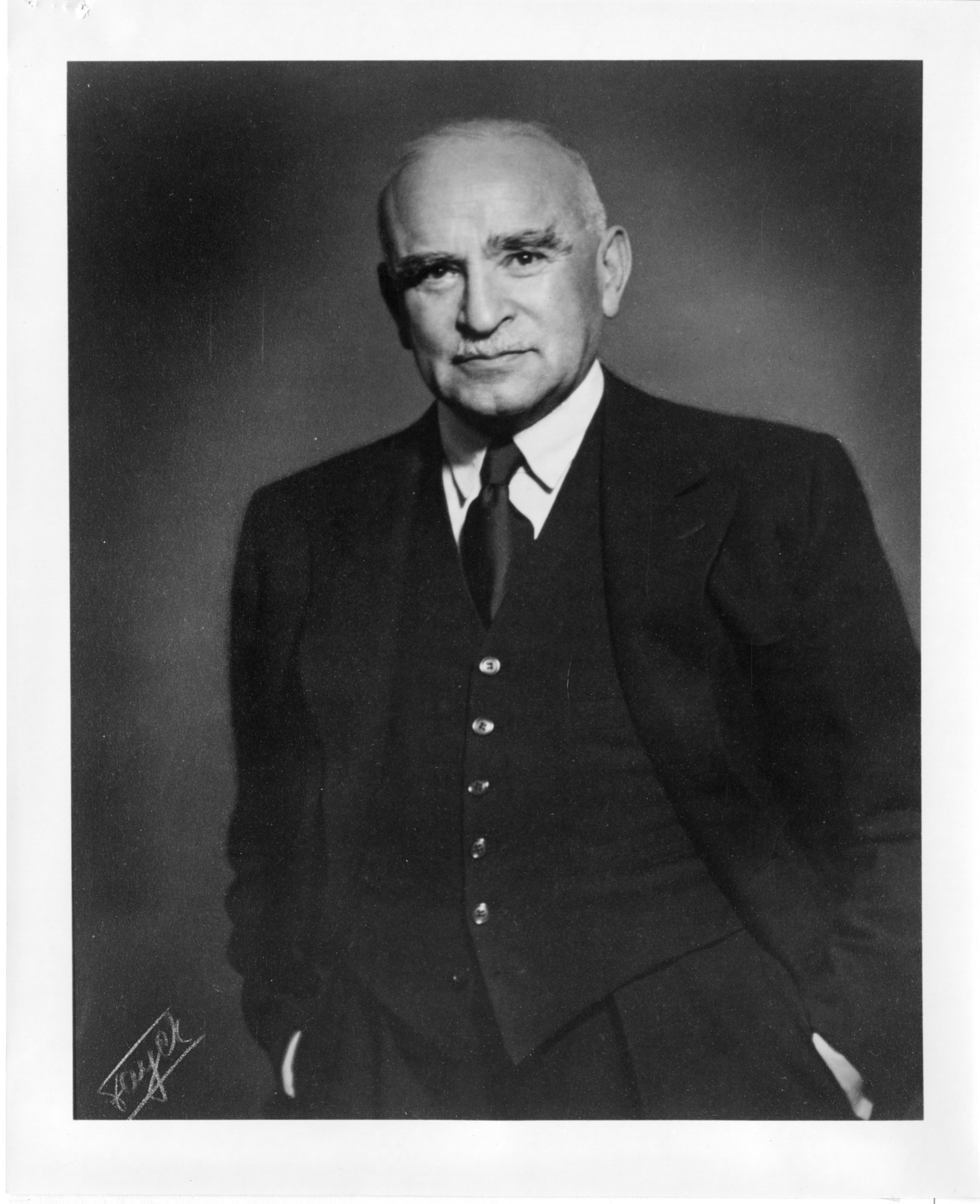 Dannie N. Heineman (1872-1962), electrical engineer, managing director, and controlling shareholder of the Belgian industrial multinational Sofina. In 1961, when this photograph was distributed, he had just donated money to establish the Niels Bohr Library at the American Institute of Physics headquarters in New York.