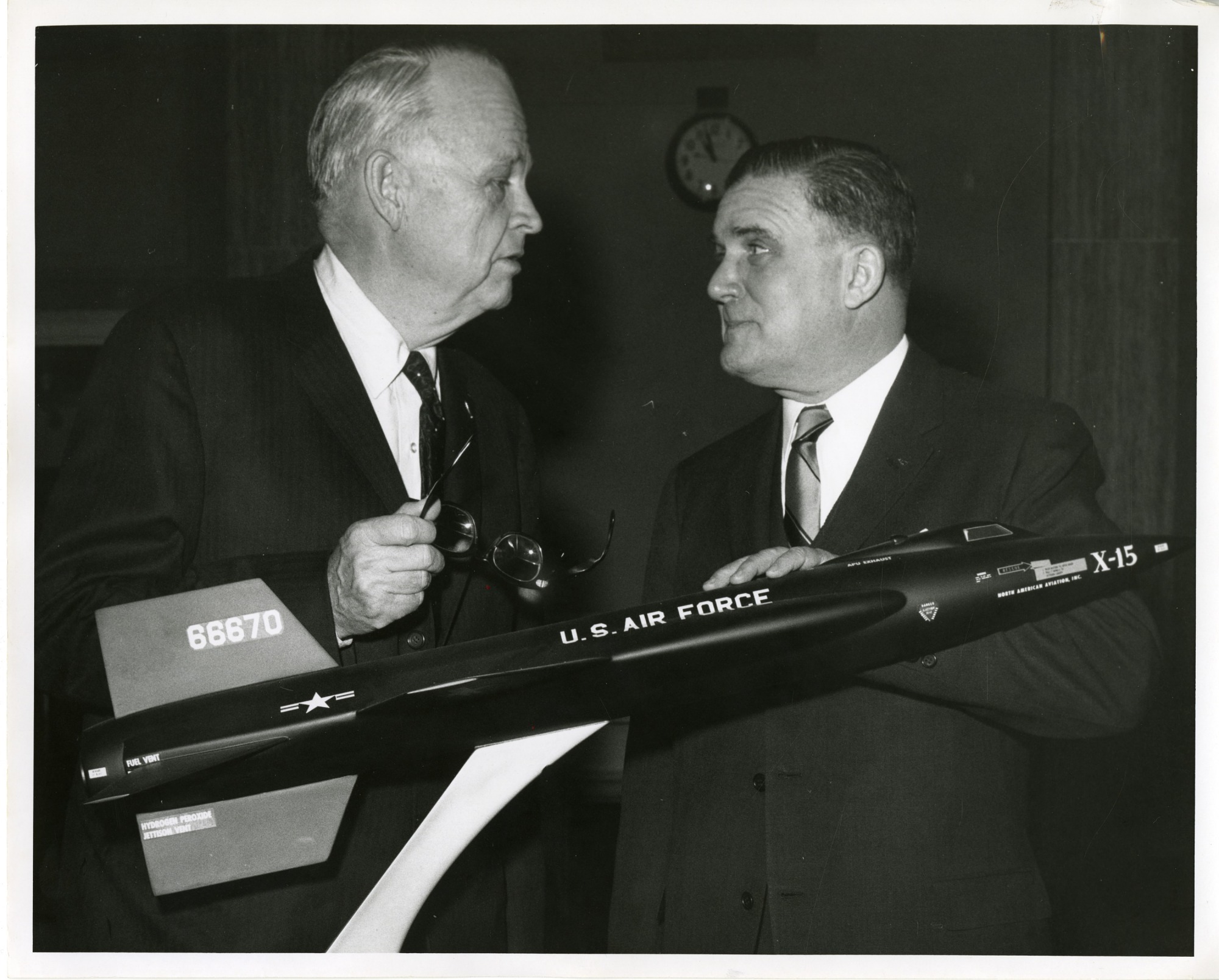 left to right: Robert Samuel Kerr (1896-1963), U.S. Senator from Oklahoma, and James Edwin Webb (1906-1992), NASA Administrator, holding model of U.S. Air Force X-15.