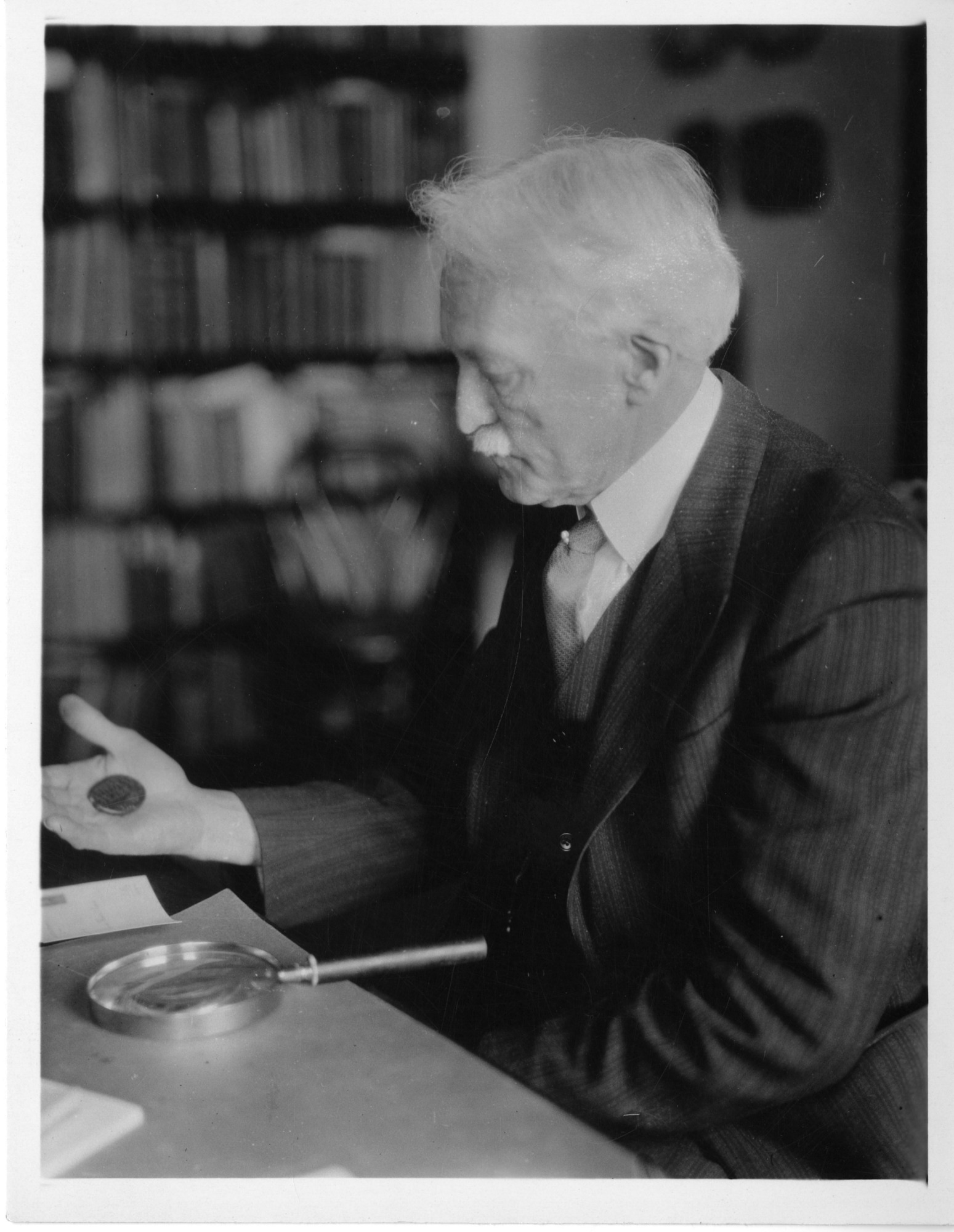 Dr. Walter Hough (1859-1935), curator of ethnology, U.S. National Museum, Smithsonian Institution, shown holding a rare cast of the Grave Creek Mound inscription which has been in the museum for more than half a century. The original stone disappeared years ago.