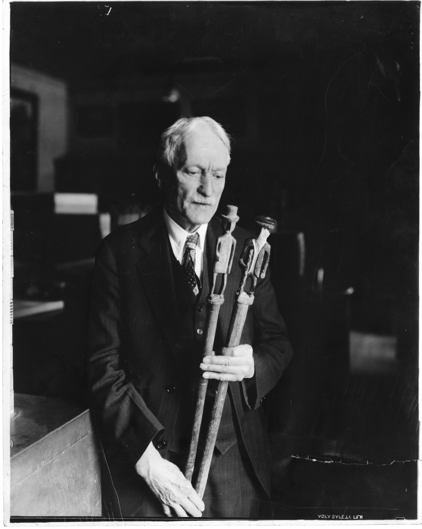 Dr. Walter Hough (1859-1935), curator of ethnology, U.S. National Museum, Smithsonian Institution, shown holding Panamanian medicine canes with carved images of Scottish physician William Patterson.